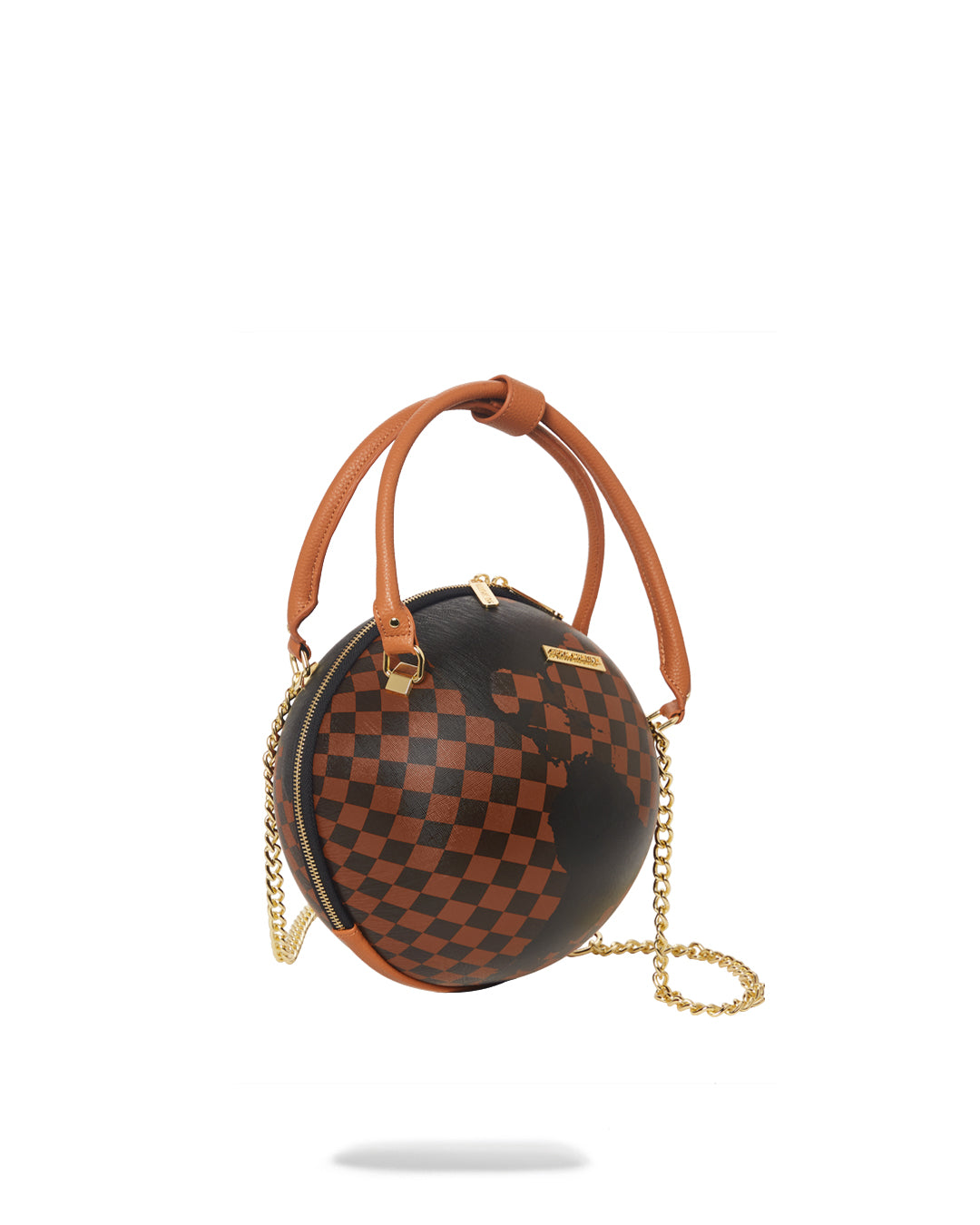 Whimsical sphere-shaped shoulder bag features sharks in Paris map printed in saffiano fabric with contrast cognac pebble fabric