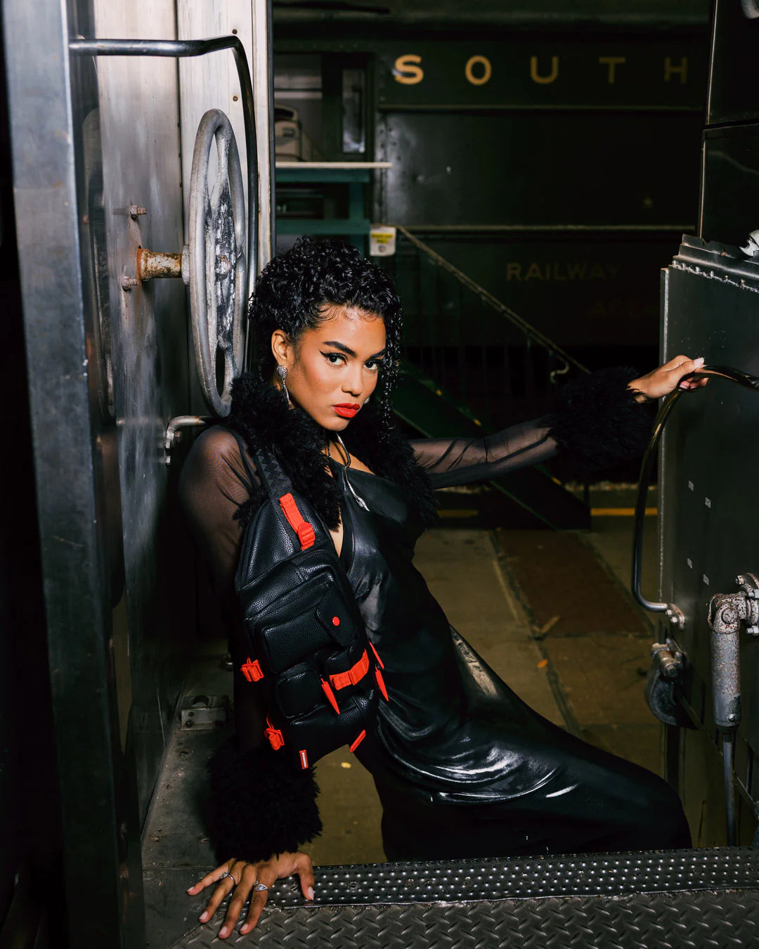 Dimensions: 14cm x 6,3cm x 38cm• Large main zipper pocket • Front zipper pocket • Adjustable double-sided VSM Strap for custom sizing • Plastic buckle closure • Zippered stash pocket