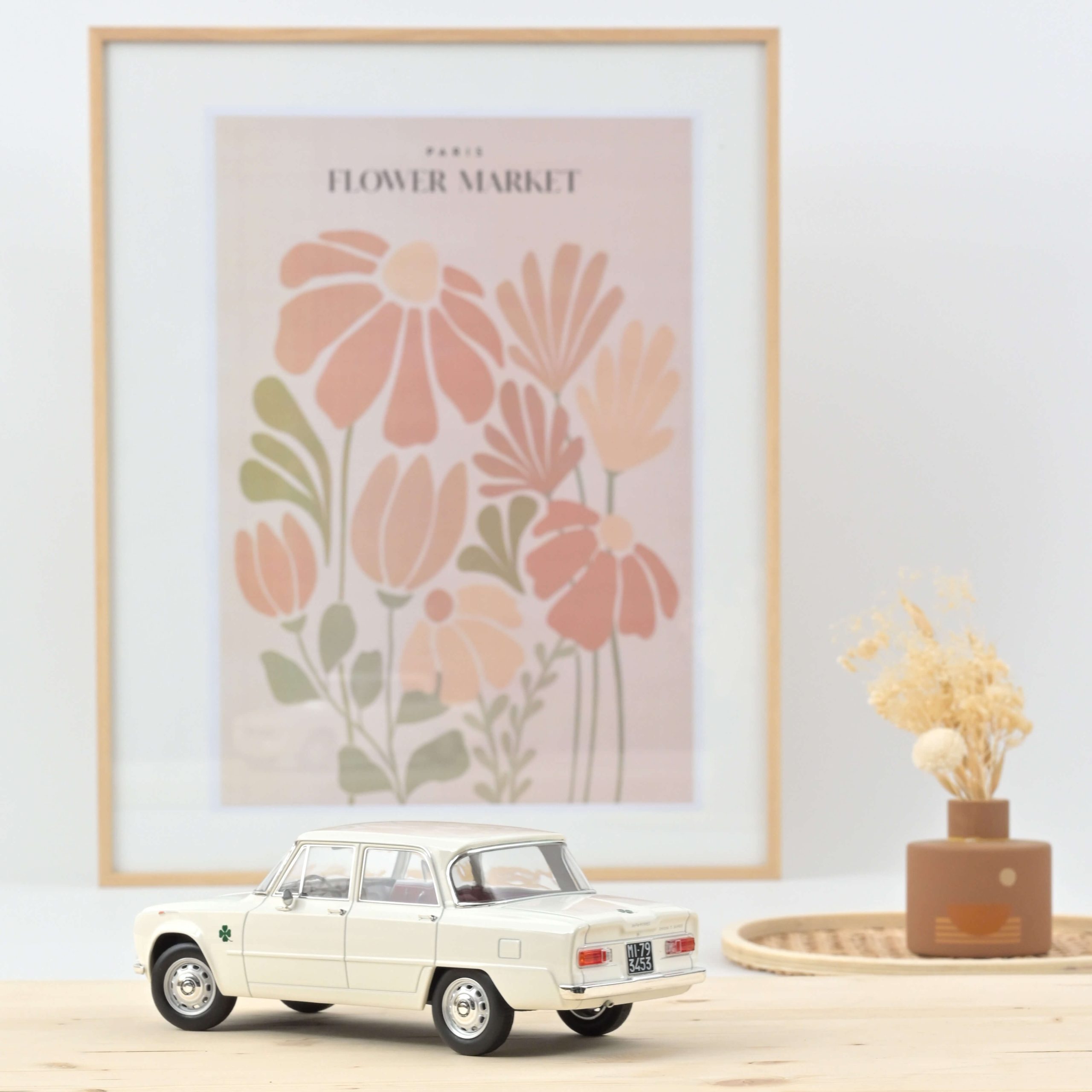 Le design de la Giulia TI Super était remarquable pour sa sophistication et son élégance, avec des lignes épurées et une finition soignée. La teinte blanche ajoutait une touche de fraîcheur et de caractère à cette voiture classique.