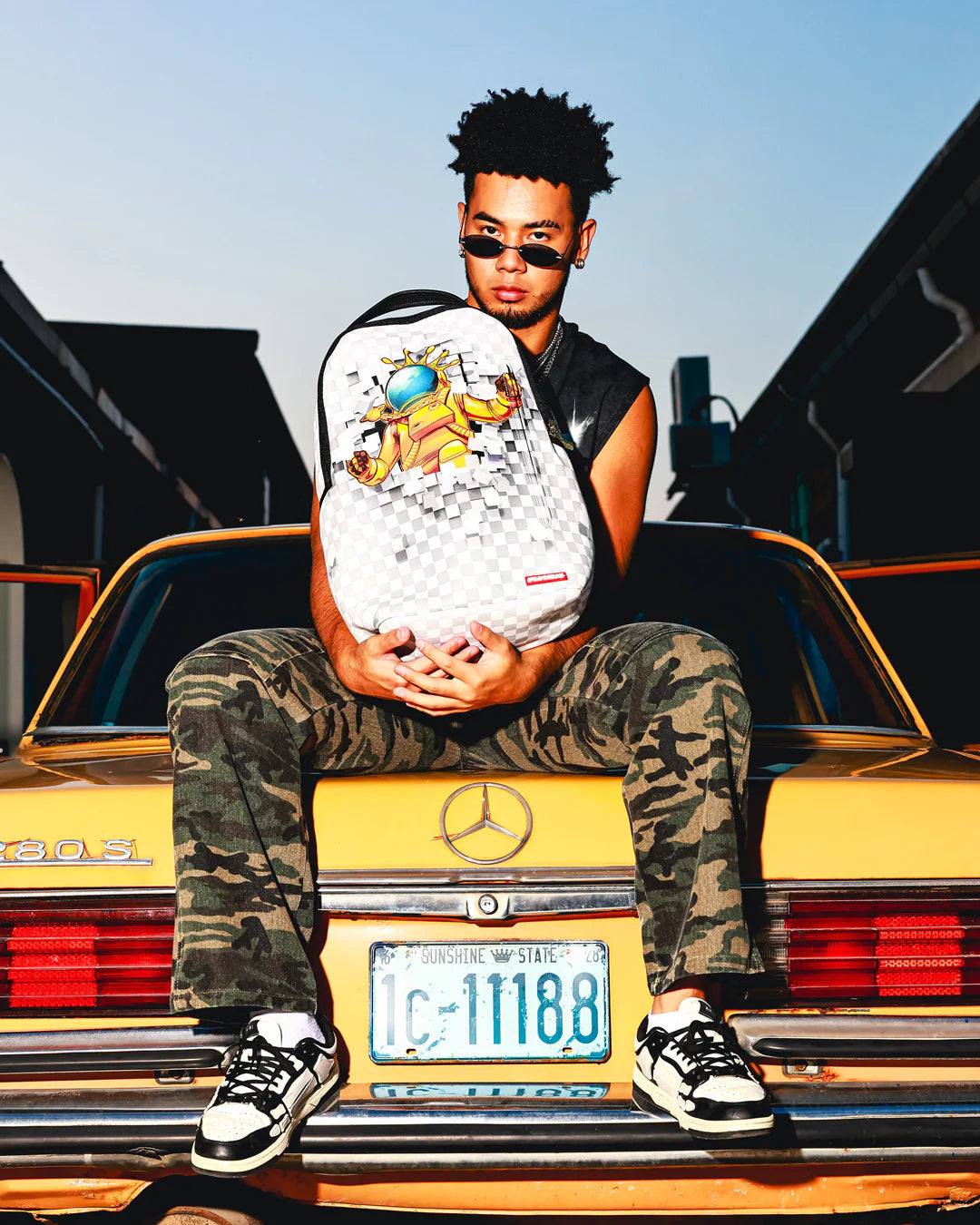 Dimensions: 18″ x 6″ x 11.5″ • Front zipper pocket • Side pockets • Zippered Stash pocket • Separate velour sunglass compartment • Ergonomic mesh back padding • Adjustable Straps for custom sizing • Gold zippers with metal hardware • Metal « Sprayground Authentic » badge • Slide through back sleeve connects to carry-on luggage to free your hands