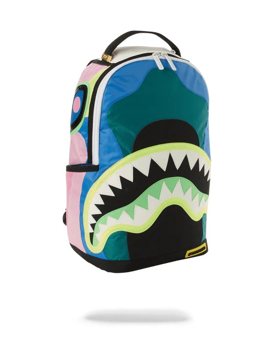 Dimensions: 46cm x 15cm x 30cm • Front zipper pocket • Side pockets • Zippered Stash pocket • Separate velour sunglass compartment • Ergonomic mesh back padding • Adjustable Straps for custom sizing • Neon chrome zippers with metal hardware • Metal « Sprayground Authentic » badge • Slide through back sleeve connects to carry-on luggage to free your hands
