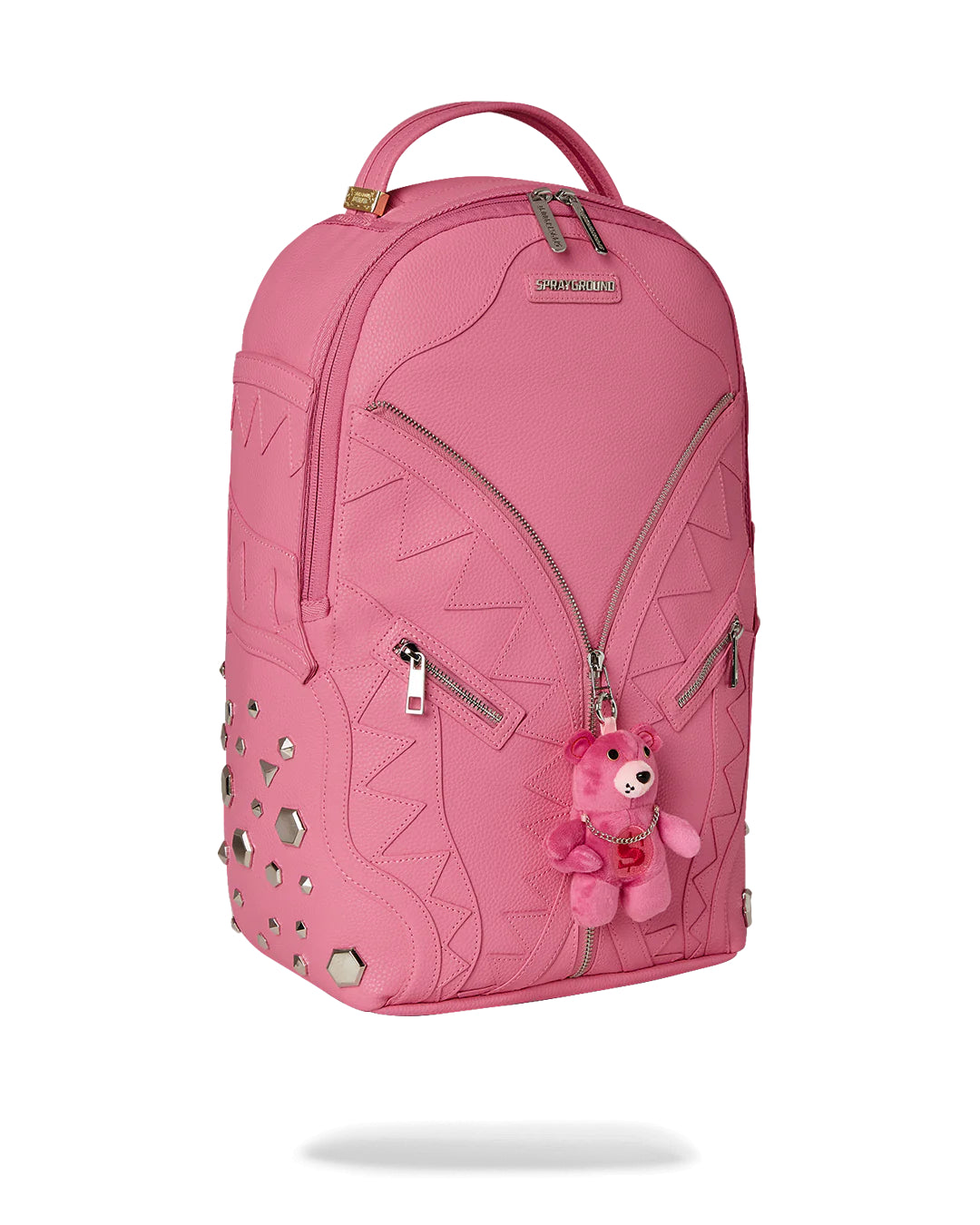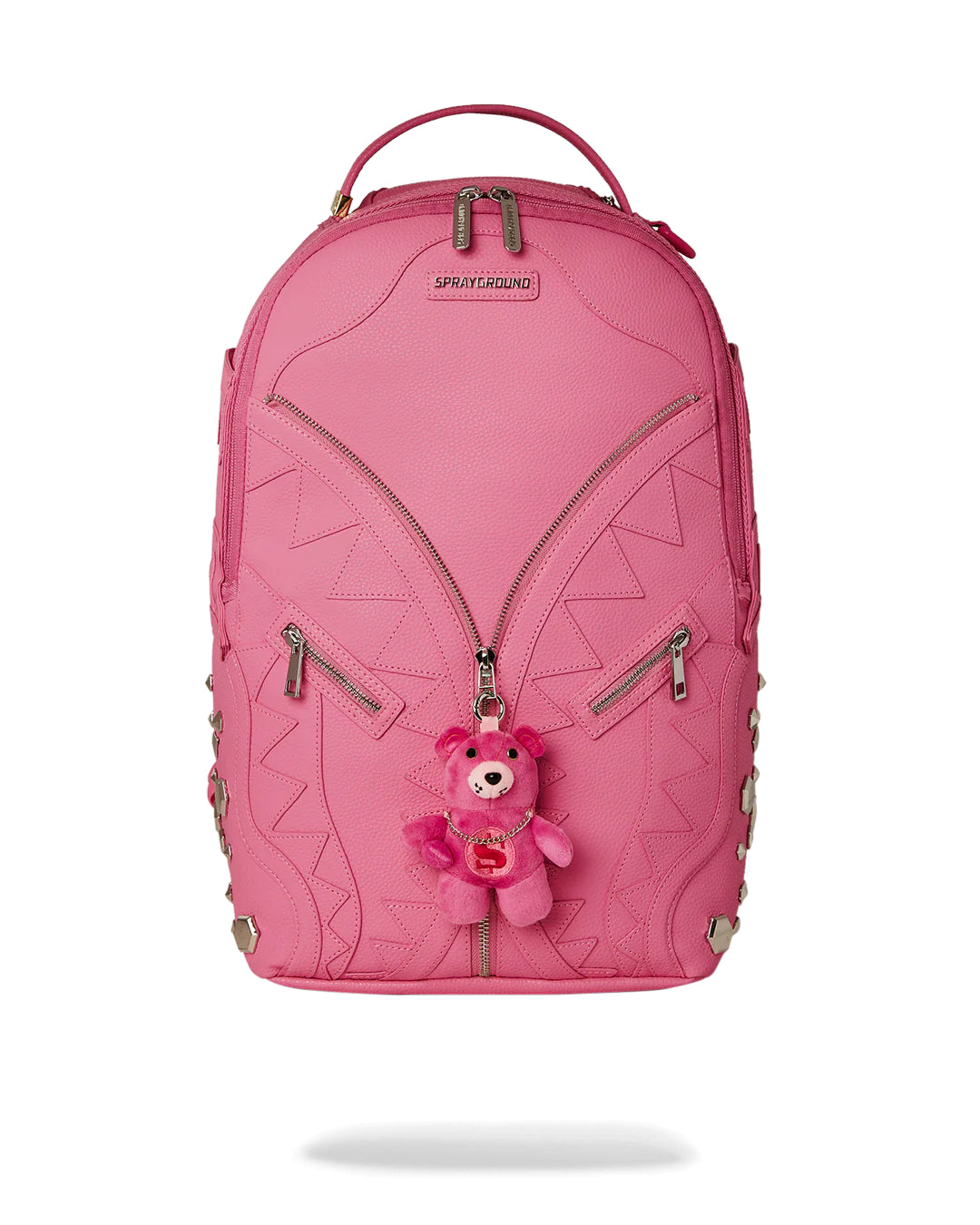 PVC with double sharkmouth cut and sew details, decorative zipper detailing includes a plush bear hanging from the center, side panels decorated with silver metal studs