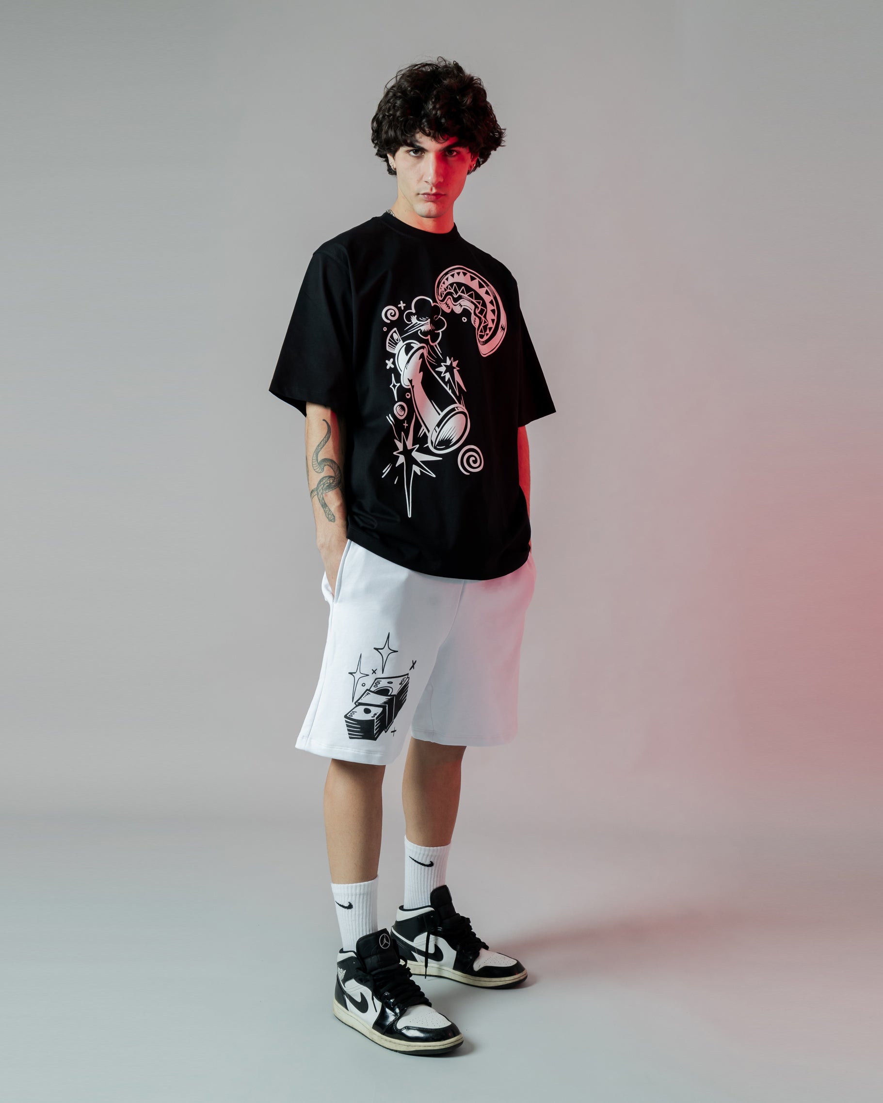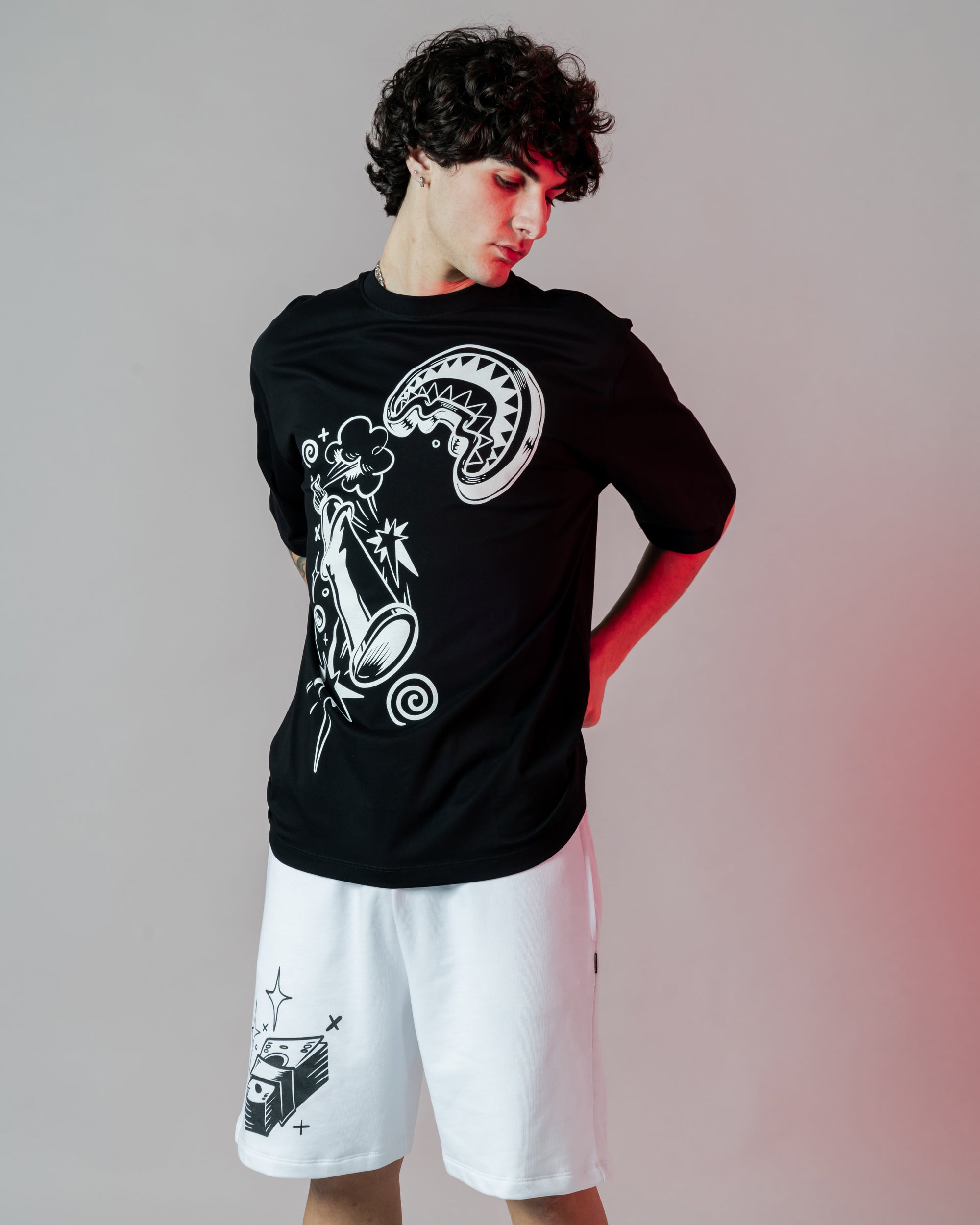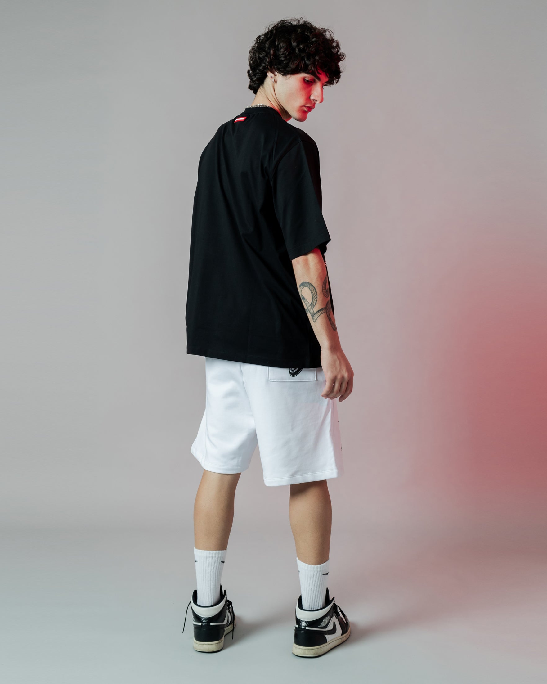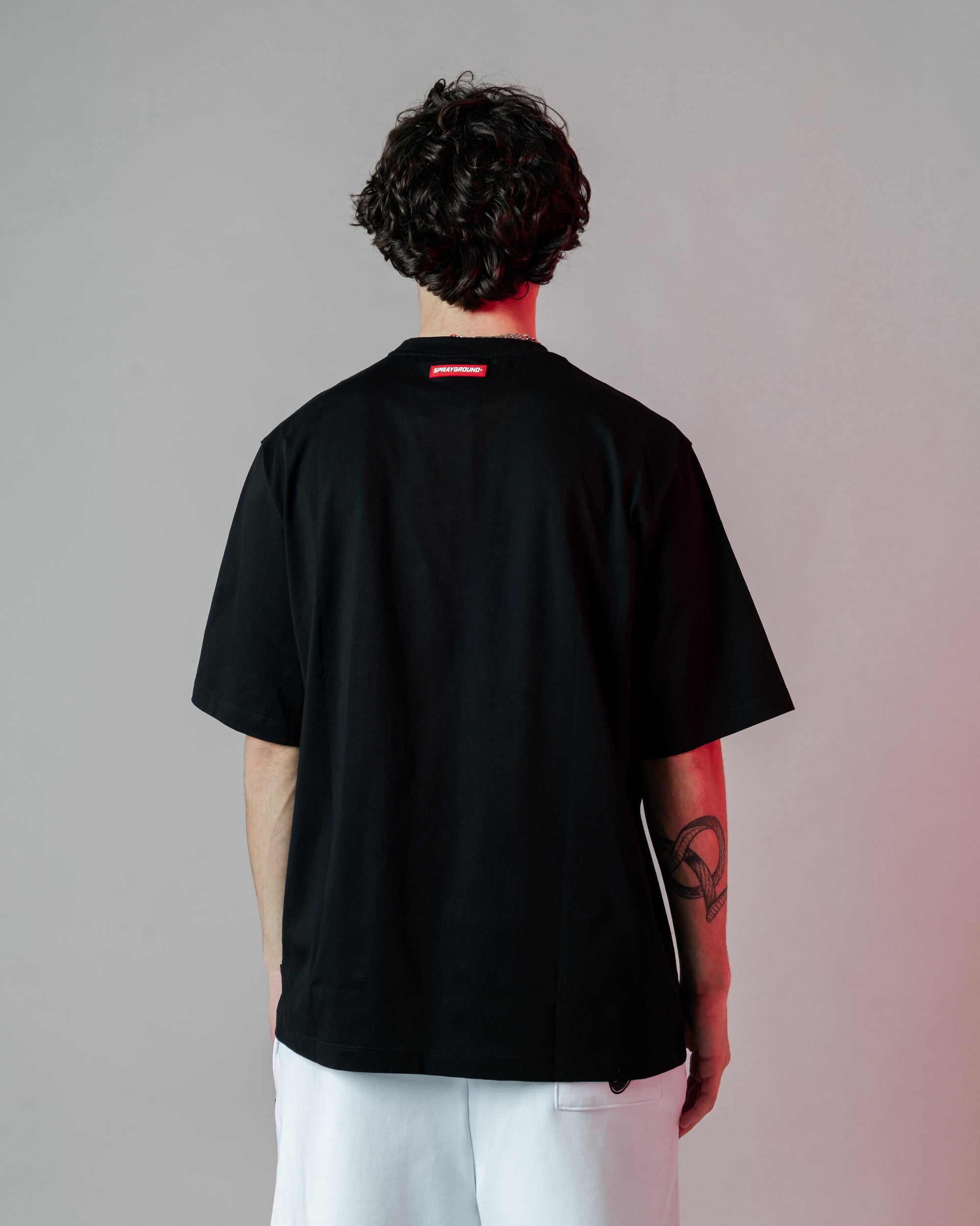 BLACK OVERSIZED T-SHIRT IN 100% COTTON JERSEY 180 GR/MQ WITH SCREEN PRINT ON THE FRONT AND SILICONE PATCH ON THE BACK.
