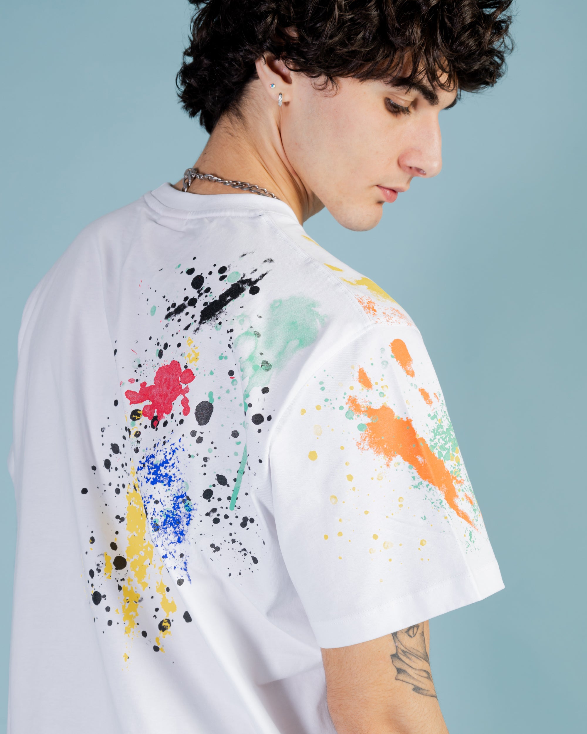 WHITE REGULAR T-SHIRT IN 100% COTTON JERSEY 180 GR/MQ. SCREEN PRINT LOGO ON FRONT, BACK, AND SLEEVE WITH PAINT SPLATTER EFFECT.