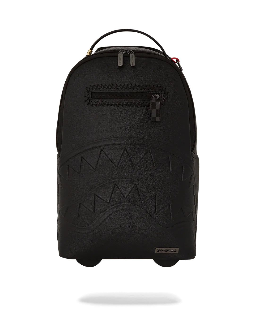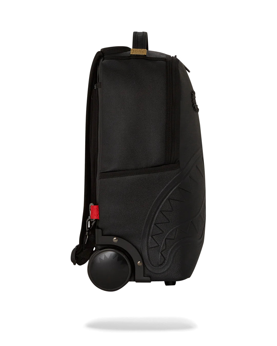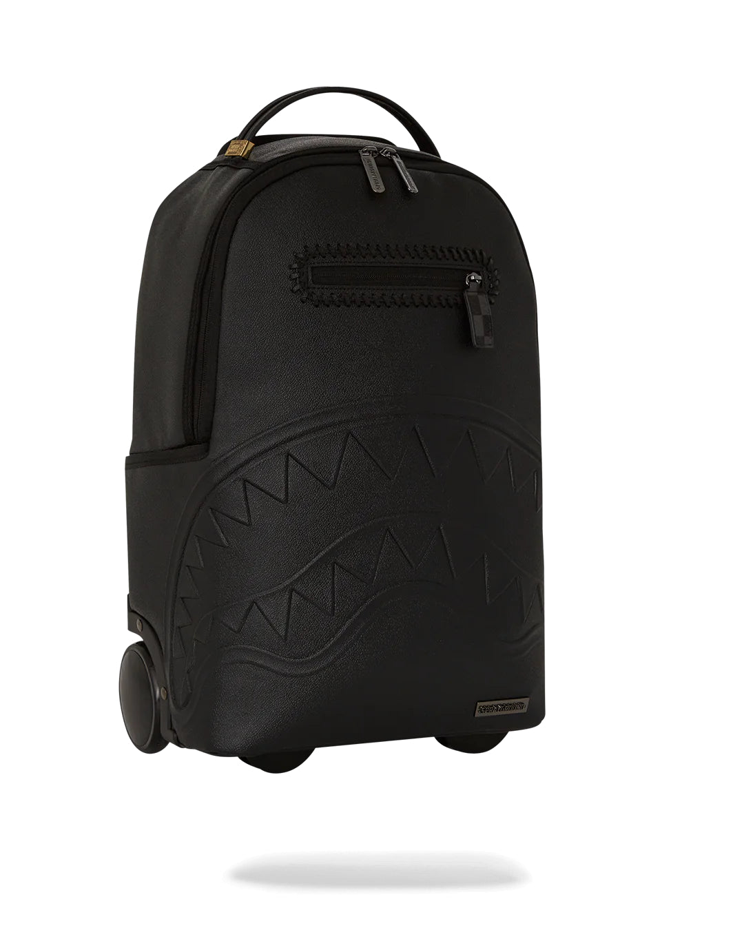 Whip stitch front zipper detail and embossed sharkmouth, wheels for traveling, bottom of straps can be unhooked to keep clean while rolling, easy zippered compartment for handle storage, suitcase handle sleeve, padded laptop compartment, interior mesh zipper, flat base, embossed zipper pulls, whip stitch luggage tag