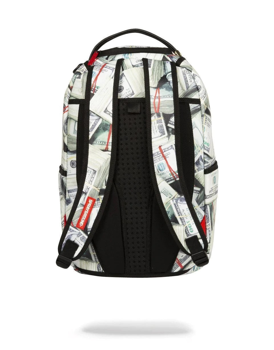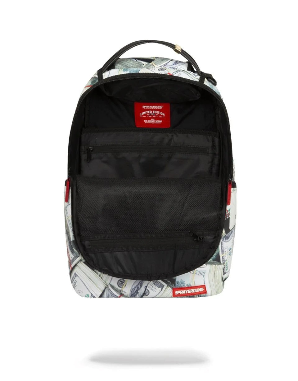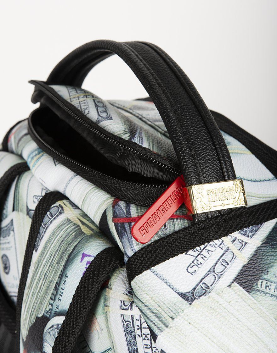 Dimensions: 46cm x 15cm x 30cm • Front zipper pocket • Side pockets • Zippered Stash pocket • Separate velour sunglass compartment • Ergonomic mesh back padding • Adjustable Straps for custom sizing • Neon chrome zippers with metal hardware • Metal « Sprayground Authentic » badge • Slide through back sleeve connects to carry-on luggage to free your hands