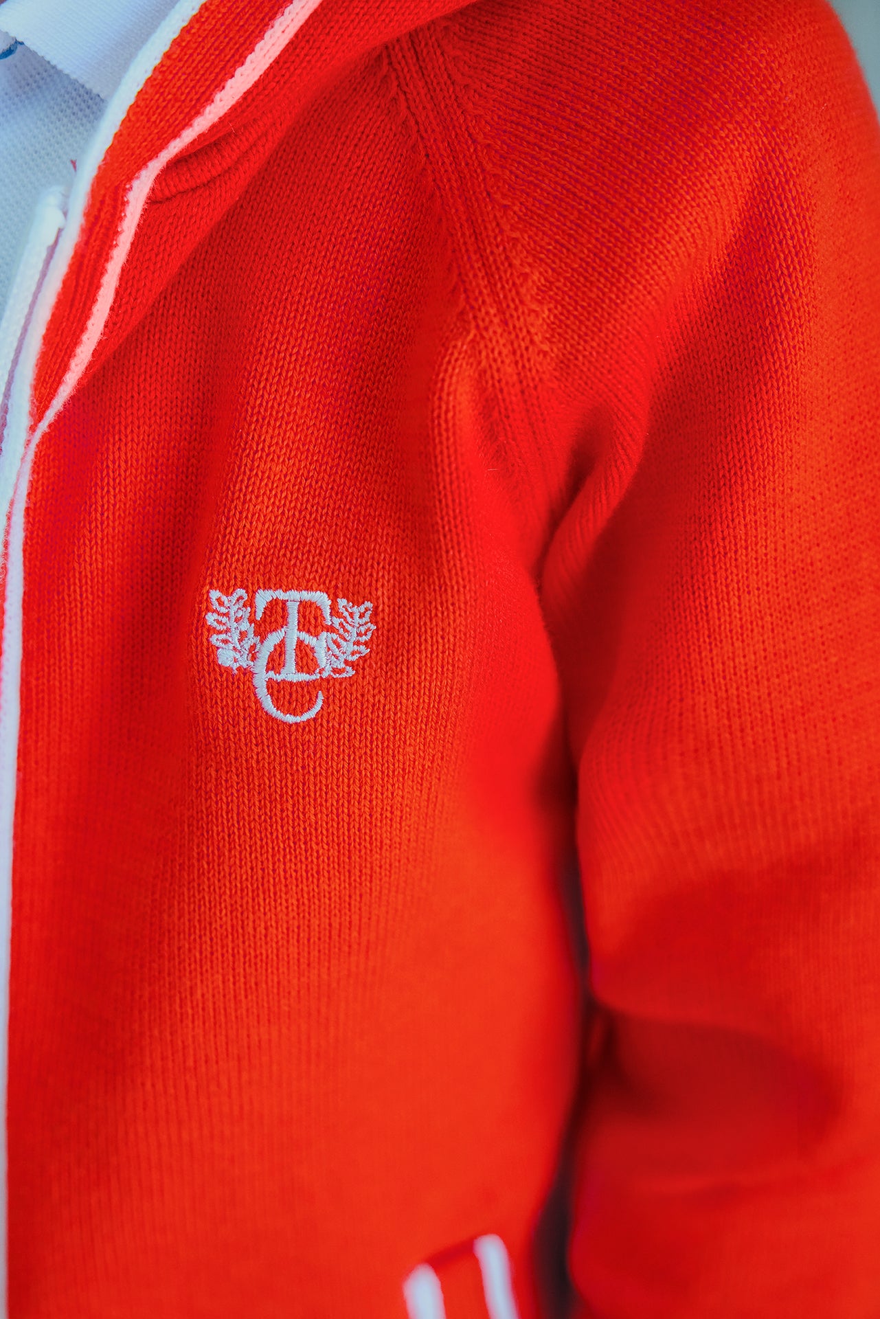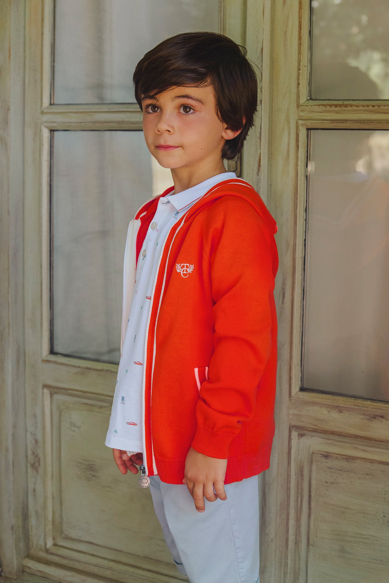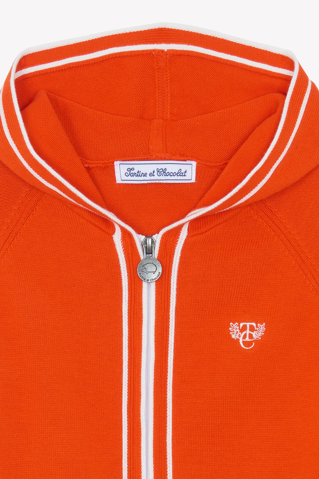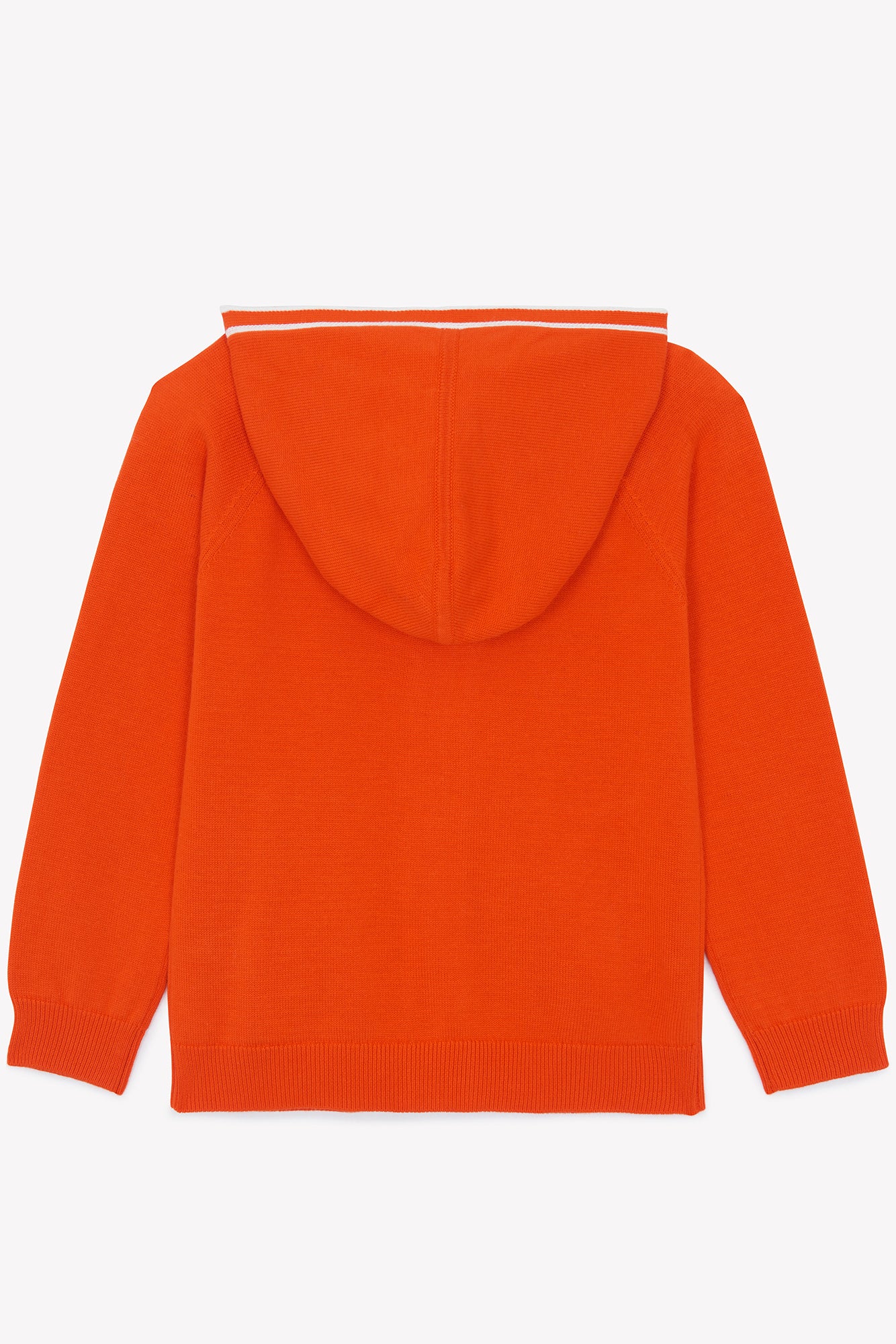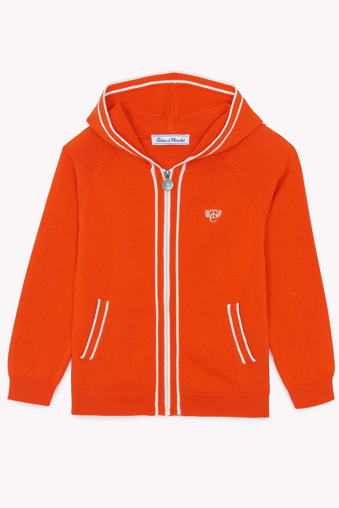 Ce gilet en maille orange pour enfant garçon, avec des détails blancs et une capuche, est orné du monogramme TC pour une touche d’élégance discrète. Idéal pour un look doux et élégant. CA18033-77