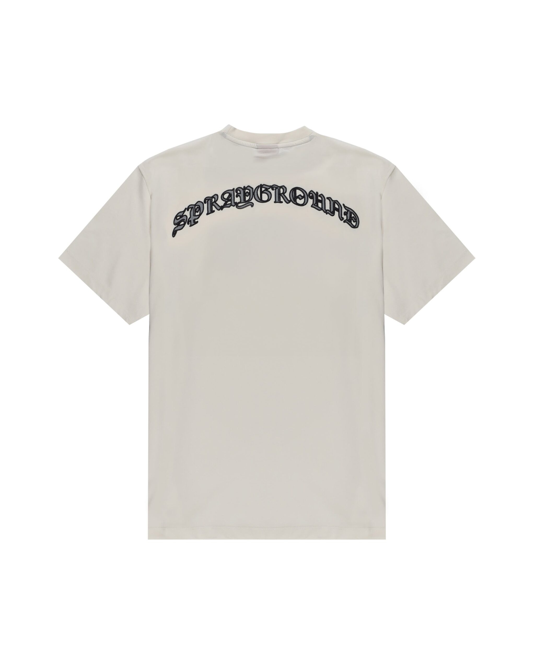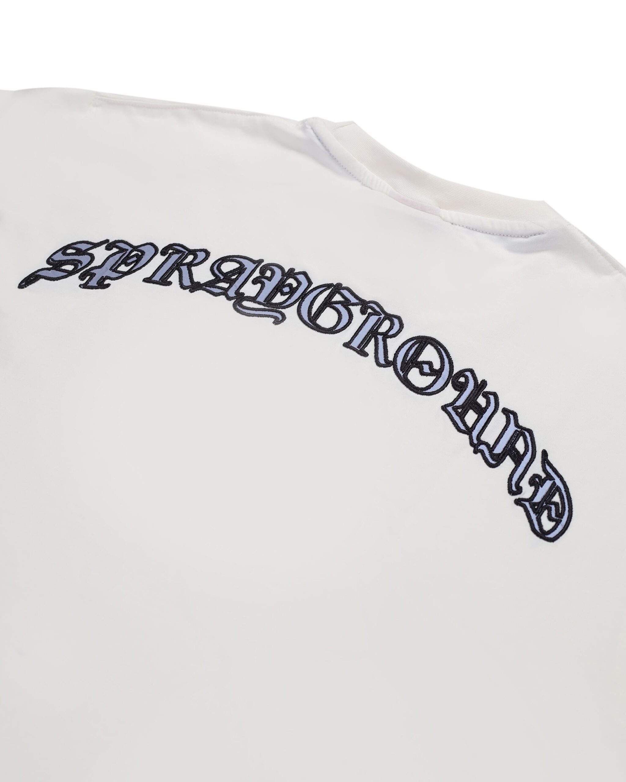 Sprayground lettering in gothic font on back in reflective fabric with contrasting embroidered outline.