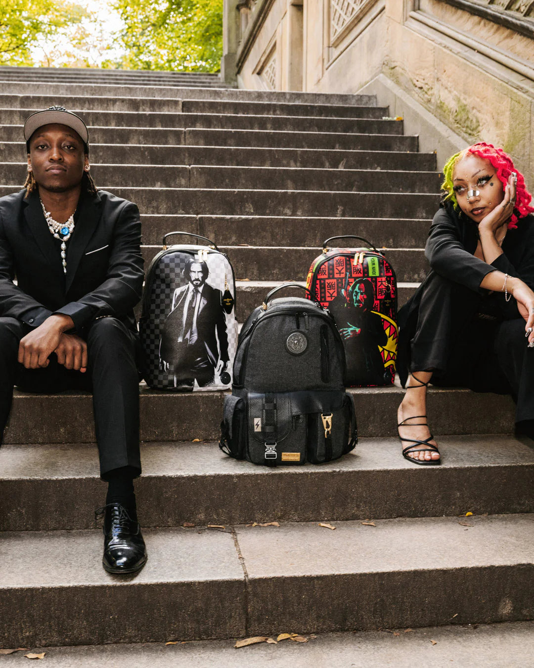 Dimensions: 45,72 cm x 15,24 cm x 29,21 cm • Front zipper pocket • Side pockets • Zippered Stash pocket • Separate velour sunglass compartment • Ergonomic mesh back padding • Adjustable Straps for custom sizing • Gold zippers with metal hardware • Metal « Sprayground Authentic » badge • Slide through back sleeve connects to carry-on luggage to free your hands