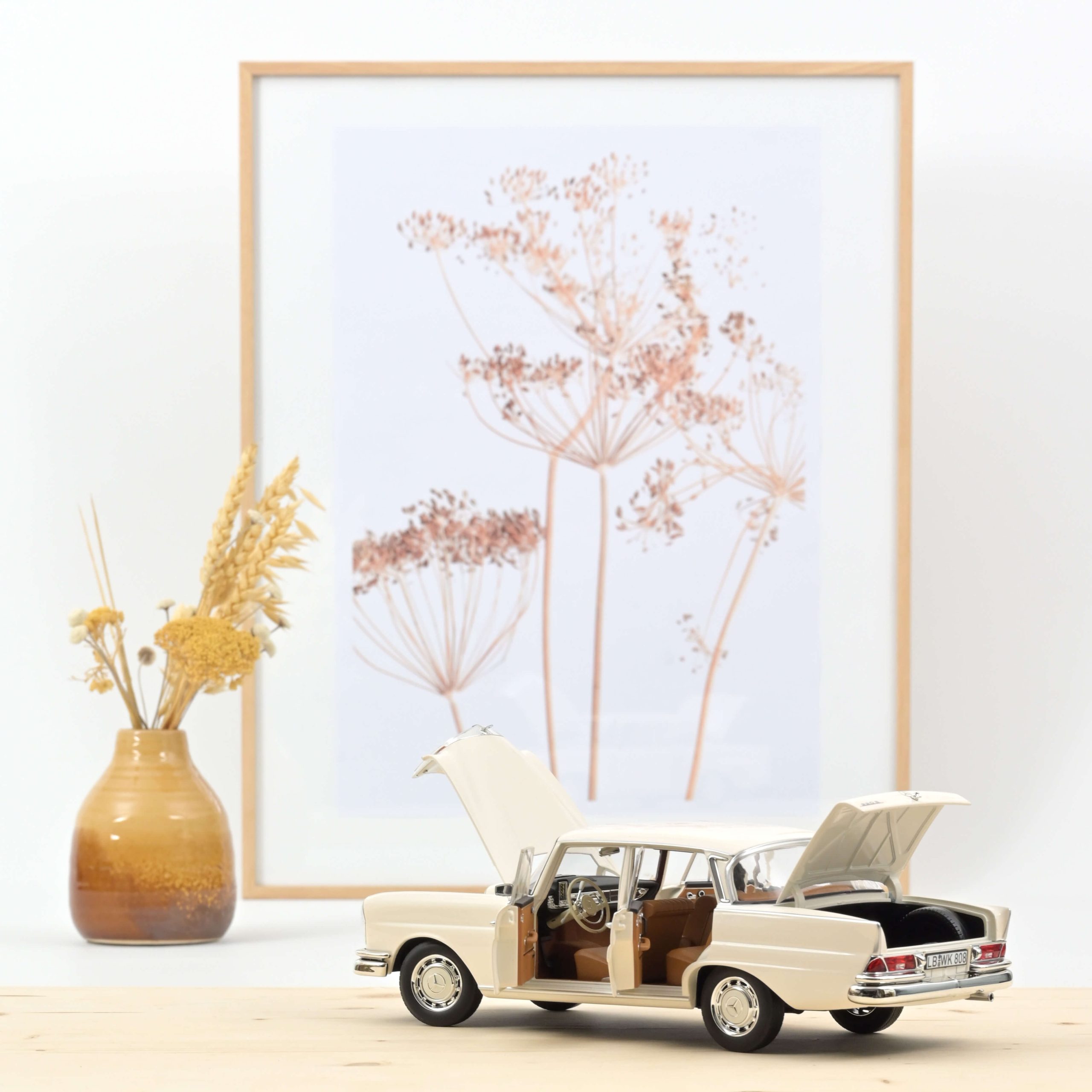 La combinaison de couleurs à la fois classiques et contemporaines, à savoir un extérieur beige crème et un intérieur brun, transporte le collectionneur dans les années du miracle économique allemand. Les capots et les portes du modèle s’ouvrent et laissent entrevoir l’intérieur opulent et la technique de la Classe S de 1965.