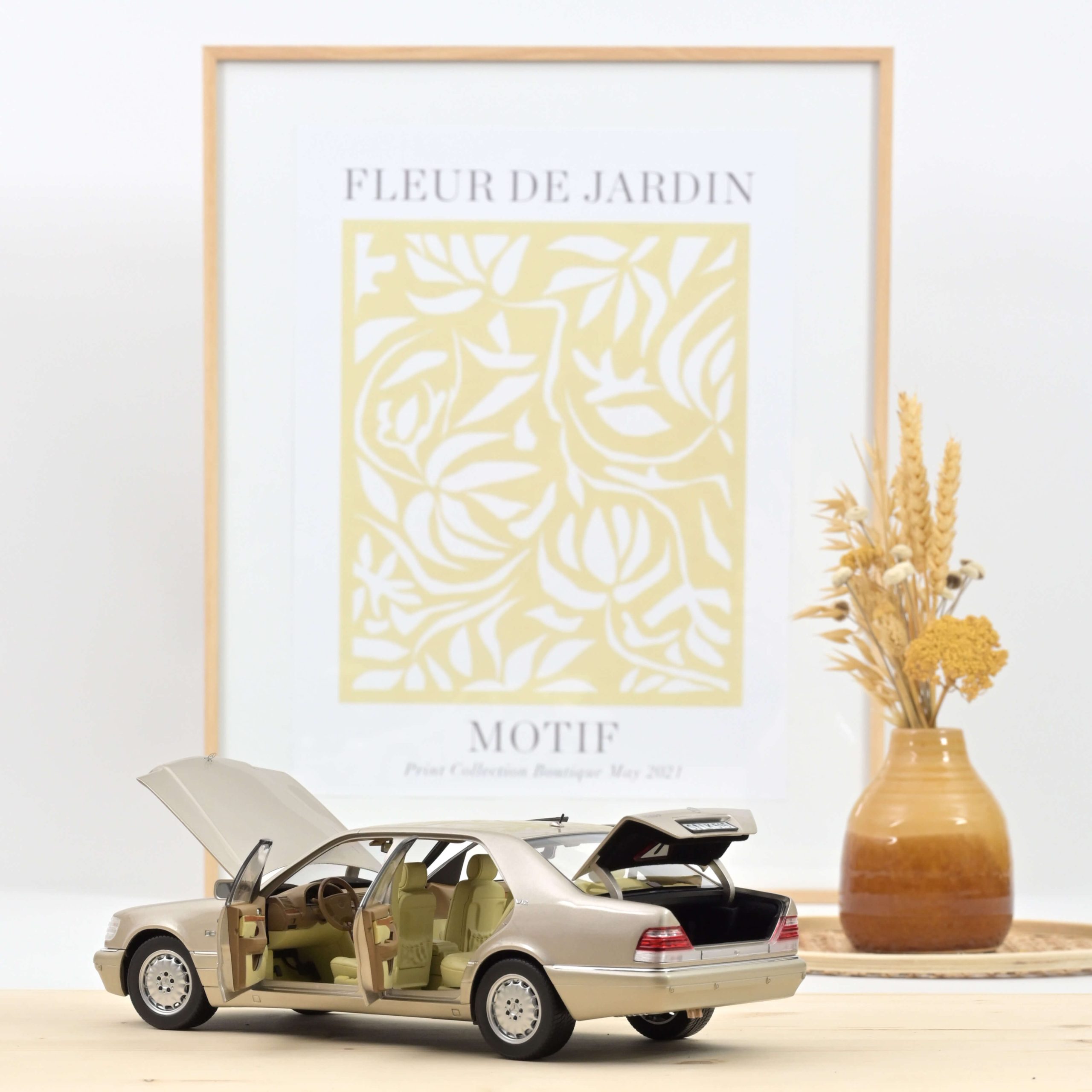Le modèle Norev montre la Classe S dans sa version la plus puissante – équipée d’un moteur V12 de 6 litres. La peinture argent fumé DB702 est plus discrète et constitue, avec l’intérieur beige, une combinaison contemporaine.