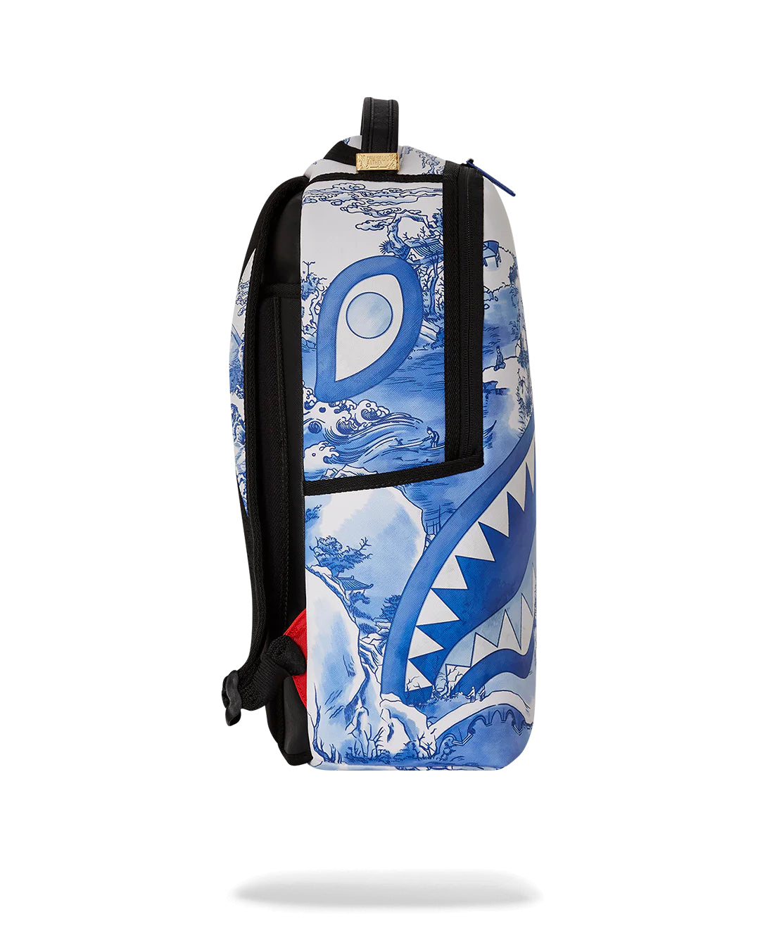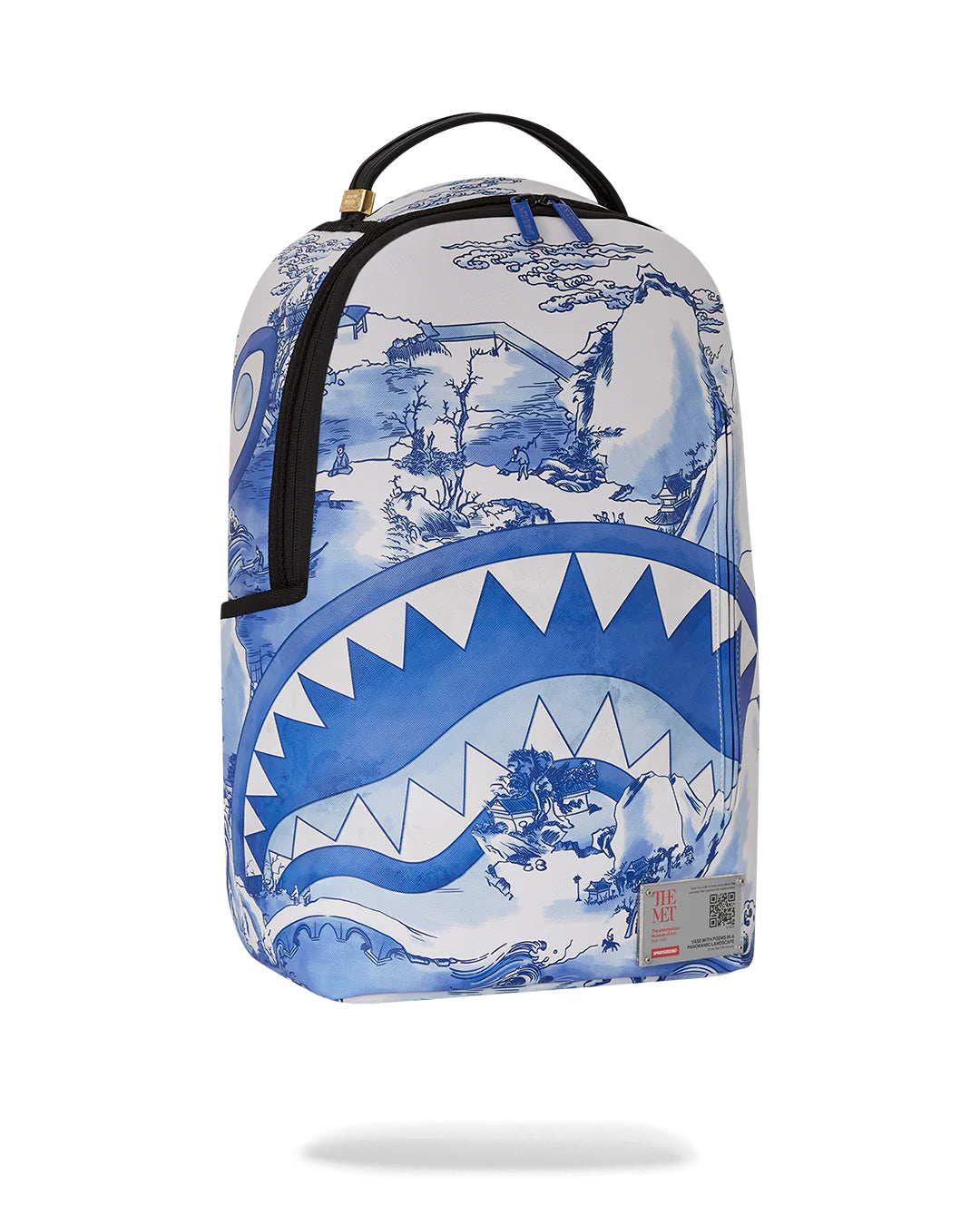 Sprayground’s signature shark mouth emerges from a Chinese landscape adapted from a late 17th-century vase in The Met collection. The Museum’s porcelain vase—an example of so-called Jingdezhen ware—commemorates a literary gathering in the 1690s at the city of Jingdezhen, a major production center of Chinese ceramics. The original vessel is richly decorated with local sites and figure groups, as well as poems and transcriptions of an essay. Collectively, they tell the true story of strangers becoming friends despite traditional class boundaries.