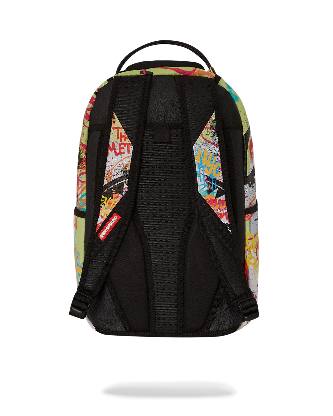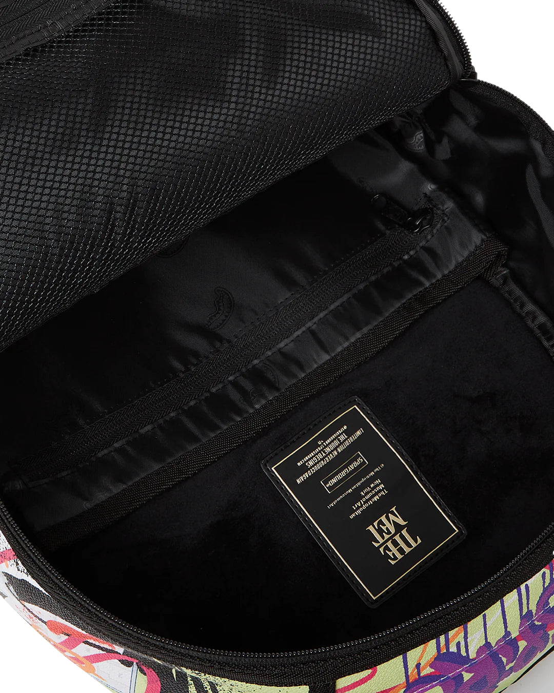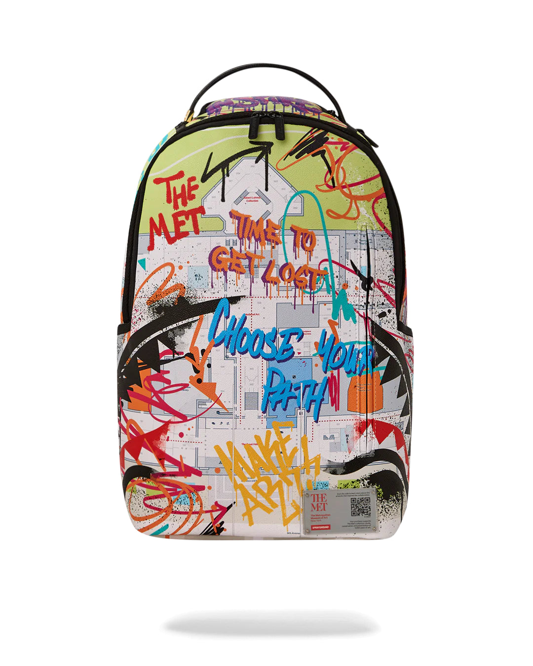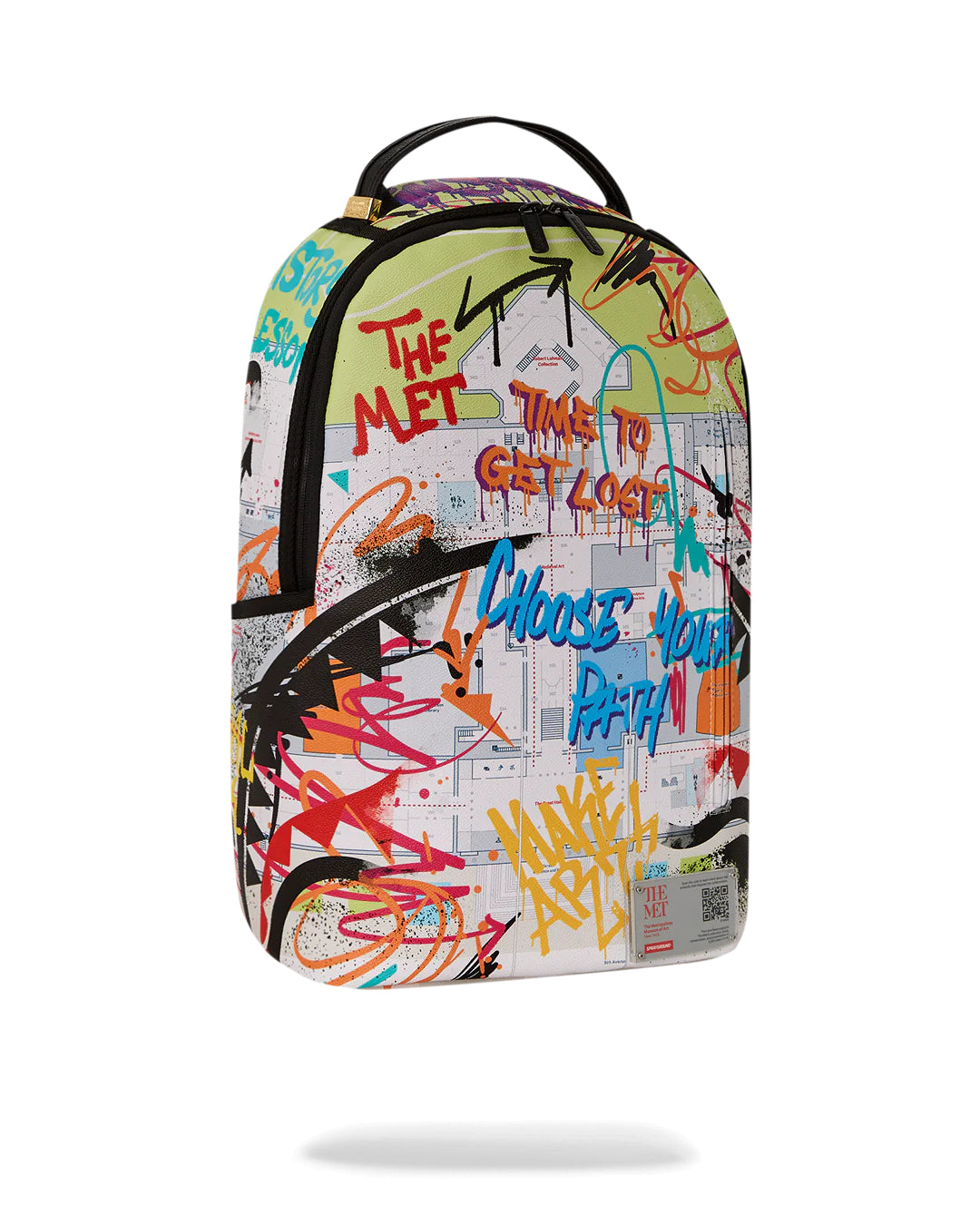 A map of The Met gets a contemporary makeover courtesy of Sprayground. This backpack displays the Museum’s blueprint customized with graffiti-like “sprays” of bold color and Sprayground’s signature shark mouth.