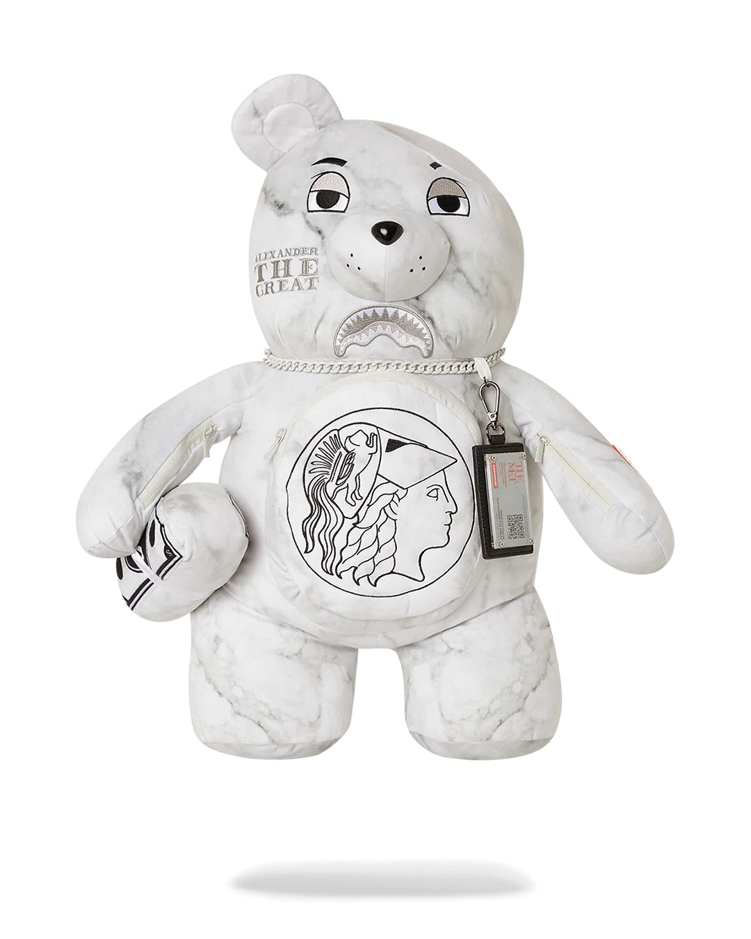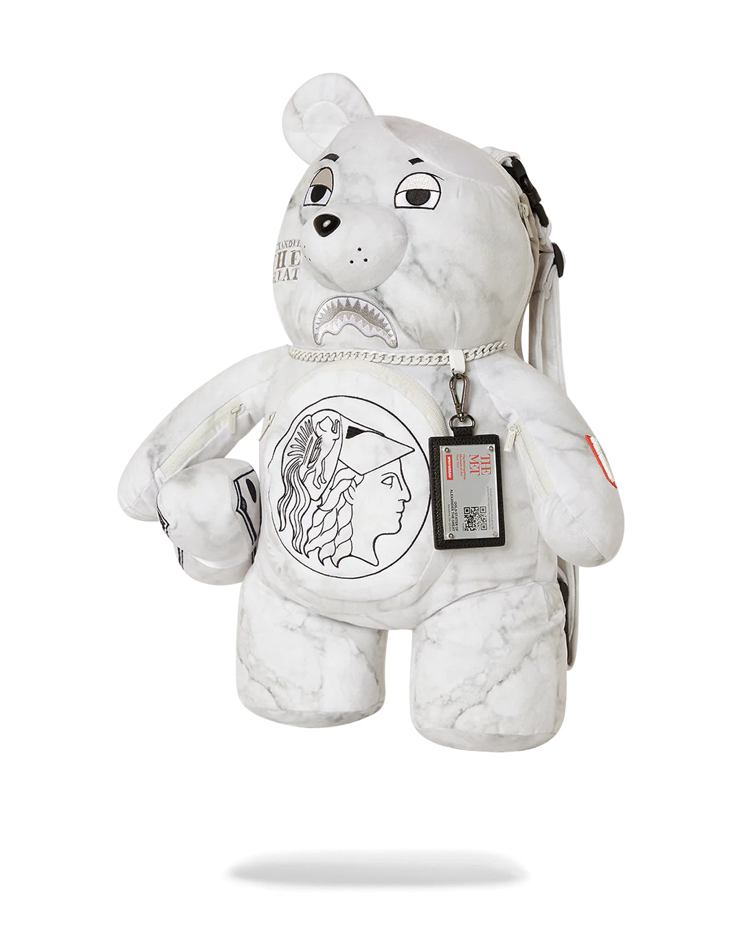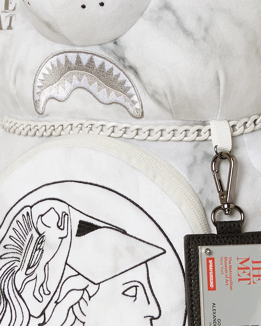 Our signature Money bear backpack enjoys a Met makeover courtesy of Sprayground. Evocative of an ancient sculpture, this bear-shaped backpack features the likeness of a Macedonian coin (336–323 BCE) forged in the name of Alexander the Great and now in the Museum’s Greek and Roman Art collection. The original gold coin showcases the head of Athena on one side and Nike on the other, both goddesses who were associated with victory in war.