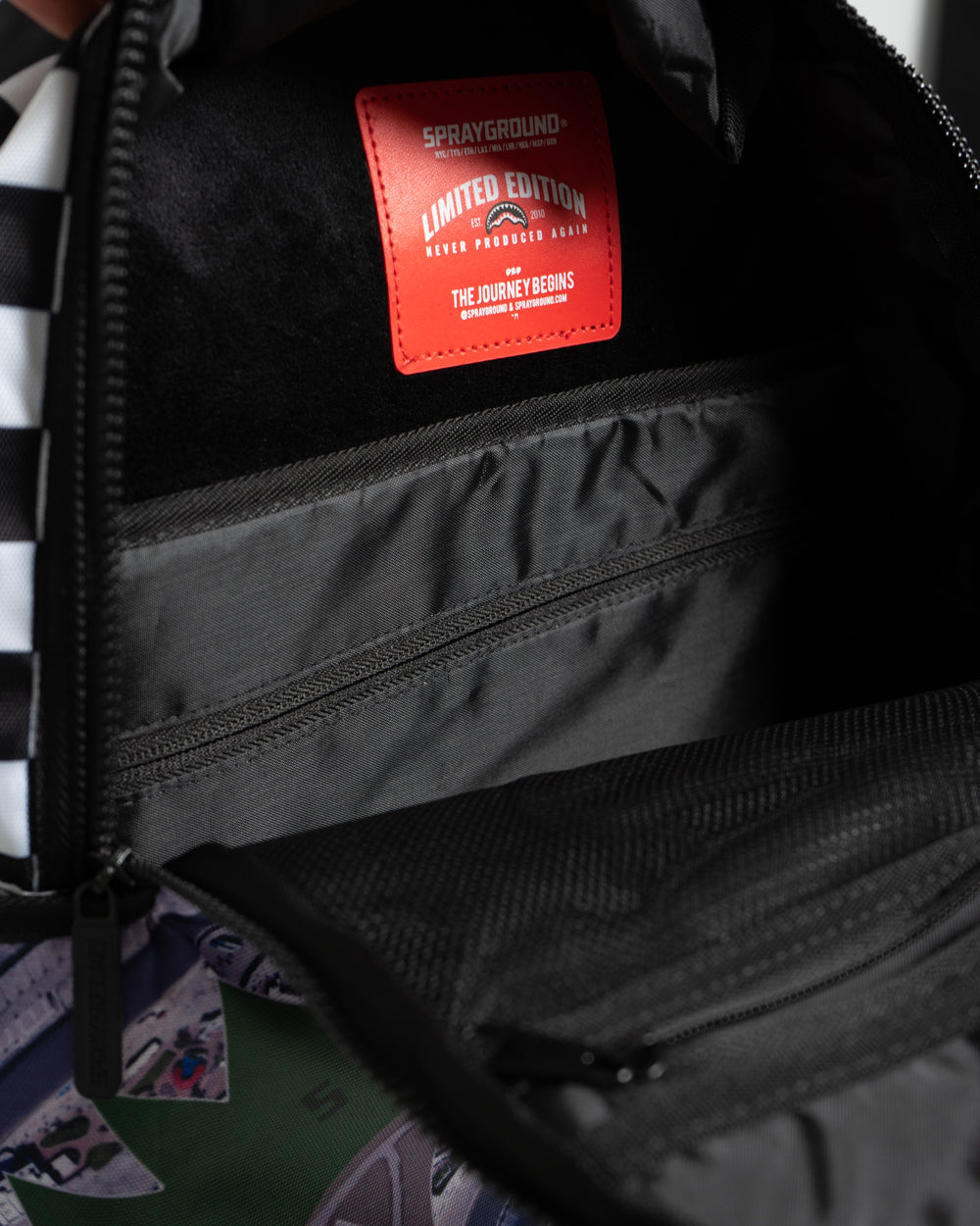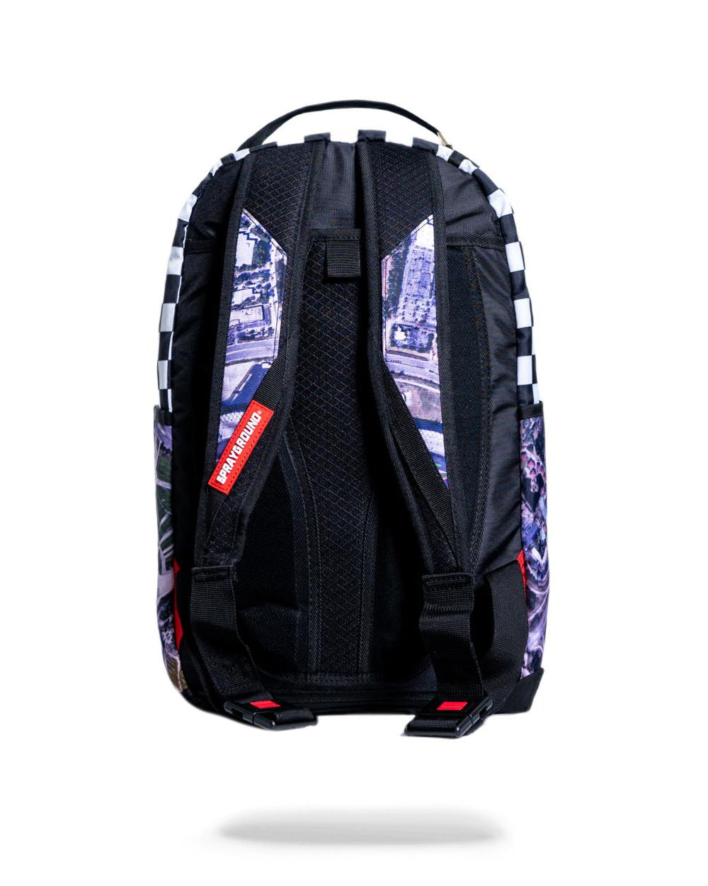 Dimensions: 18″ x 6″ x 11.5″ • Front zipper pocket • Side pockets • Zippered Stash pocket • Separate velour sunglass compartment • Ergonomic mesh back padding • Adjustable Straps for custom sizing • Gold zippers with metal hardware • Metal « Sprayground Authentic » badge • Slide through back sleeve connects to carry-on luggage to free your hands