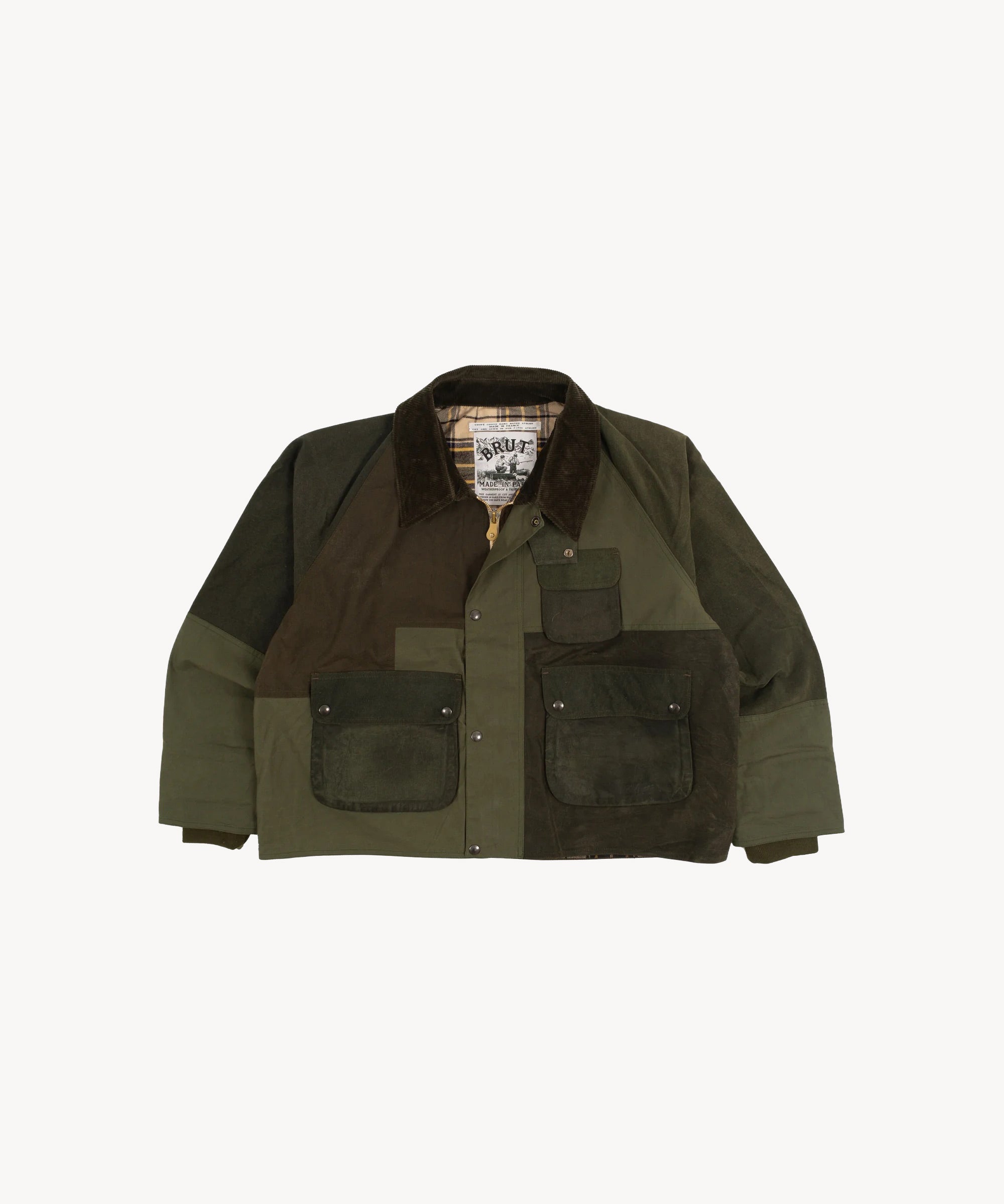 The REWORK® BARBOUR V5 is crafted from curated vintage Barbour and British Millerain dry waxed fabric in a patchwork style. Each jacket is one of a kind, made from vintage materials and quality hardware. To honor this legacy, all of our REWORK® BARBOUR V5 jackets are cut and sewn with vintage equipment in our atelier in Paris.
