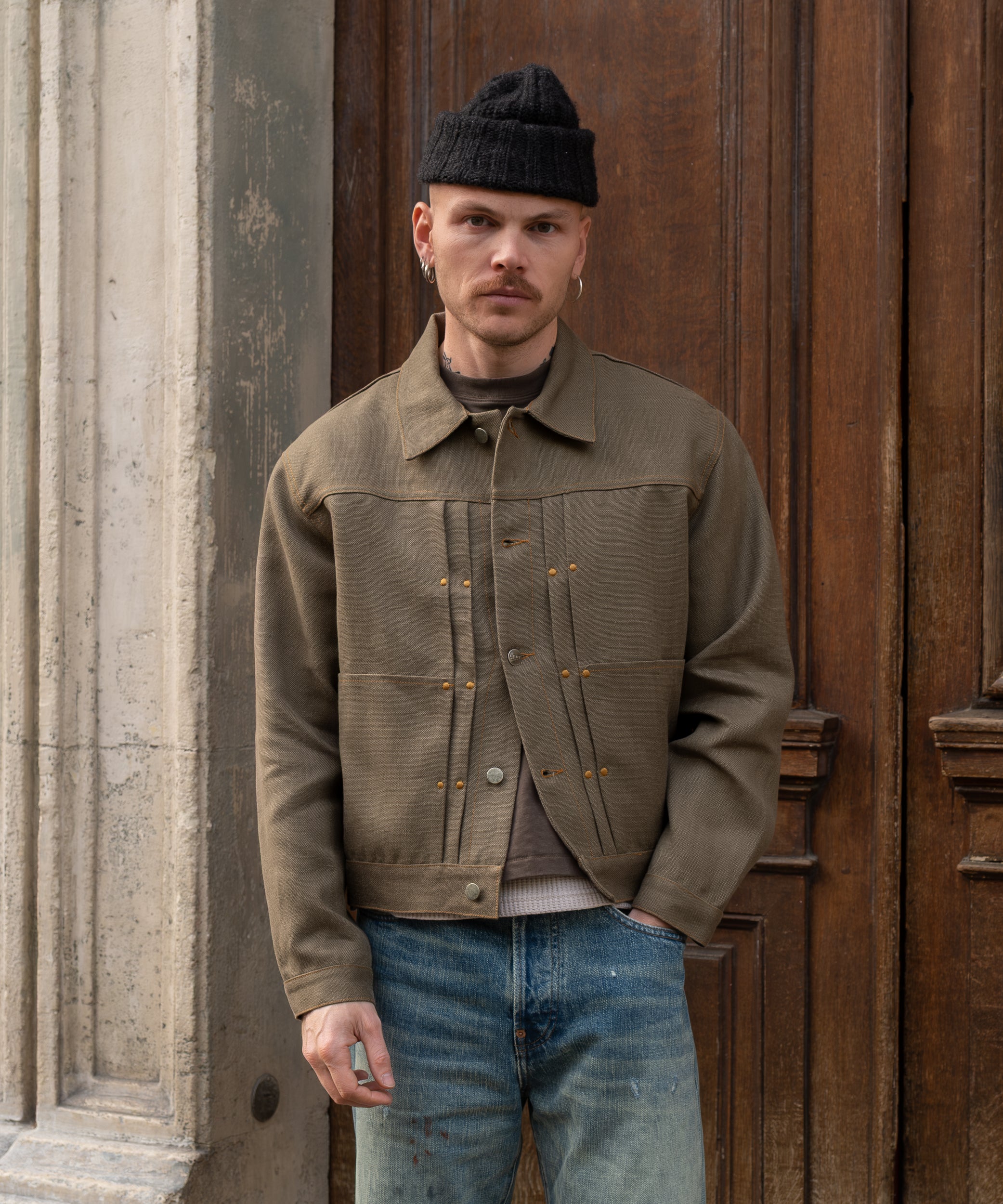 The PLEATED LINEN JACKET is a nod to American workwear design from our archives. Crafted from high-quality denim fabric, it is designed for all-day comfort. BRUT’s commitment to quality ensures that this jacket will stand the test of time. Proudly made in PARIS in our atelier sew on vintage equipment.