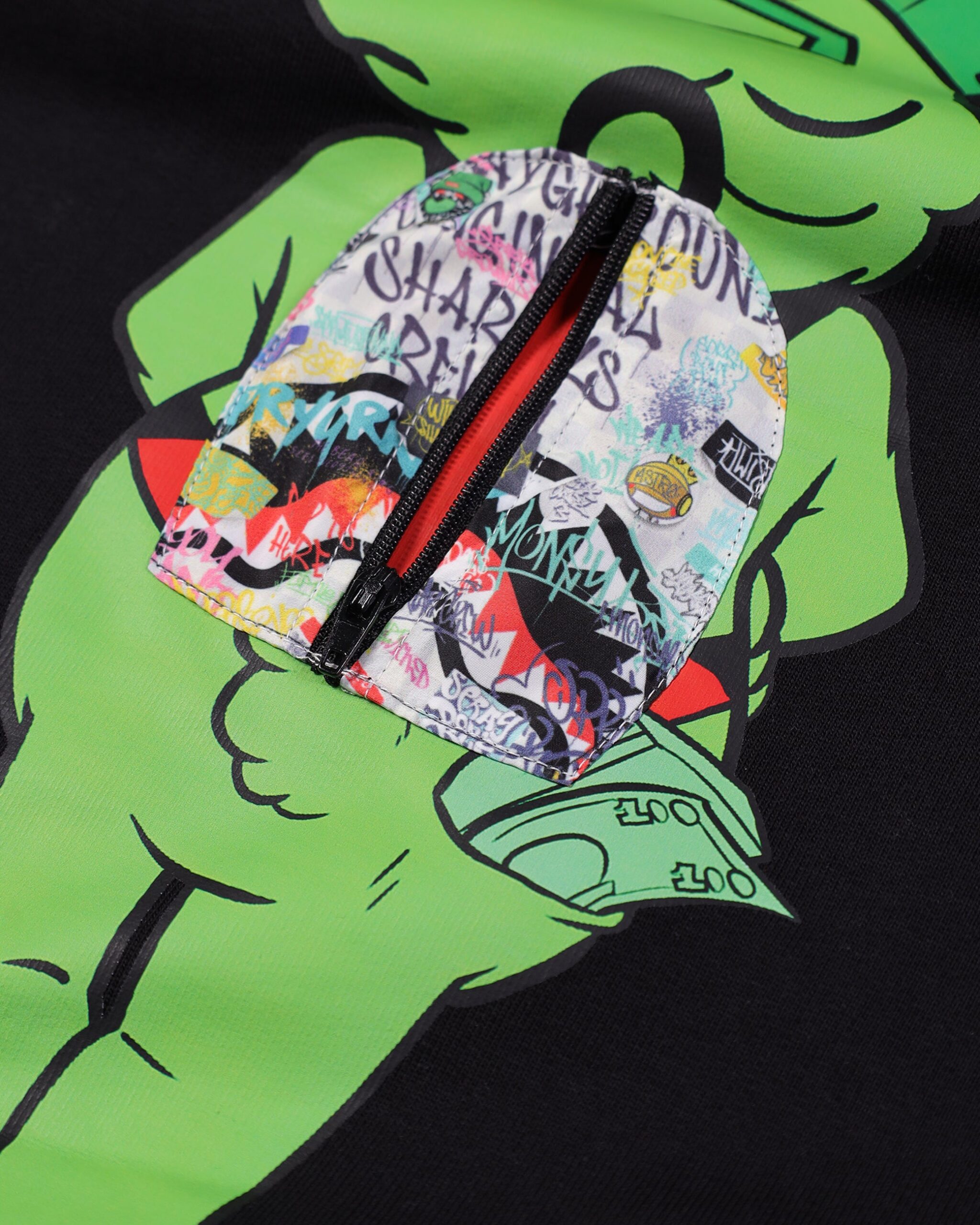 Bear print placed with application of a mini reproduction of a printed nylon backpack that actually opens with a zipper.