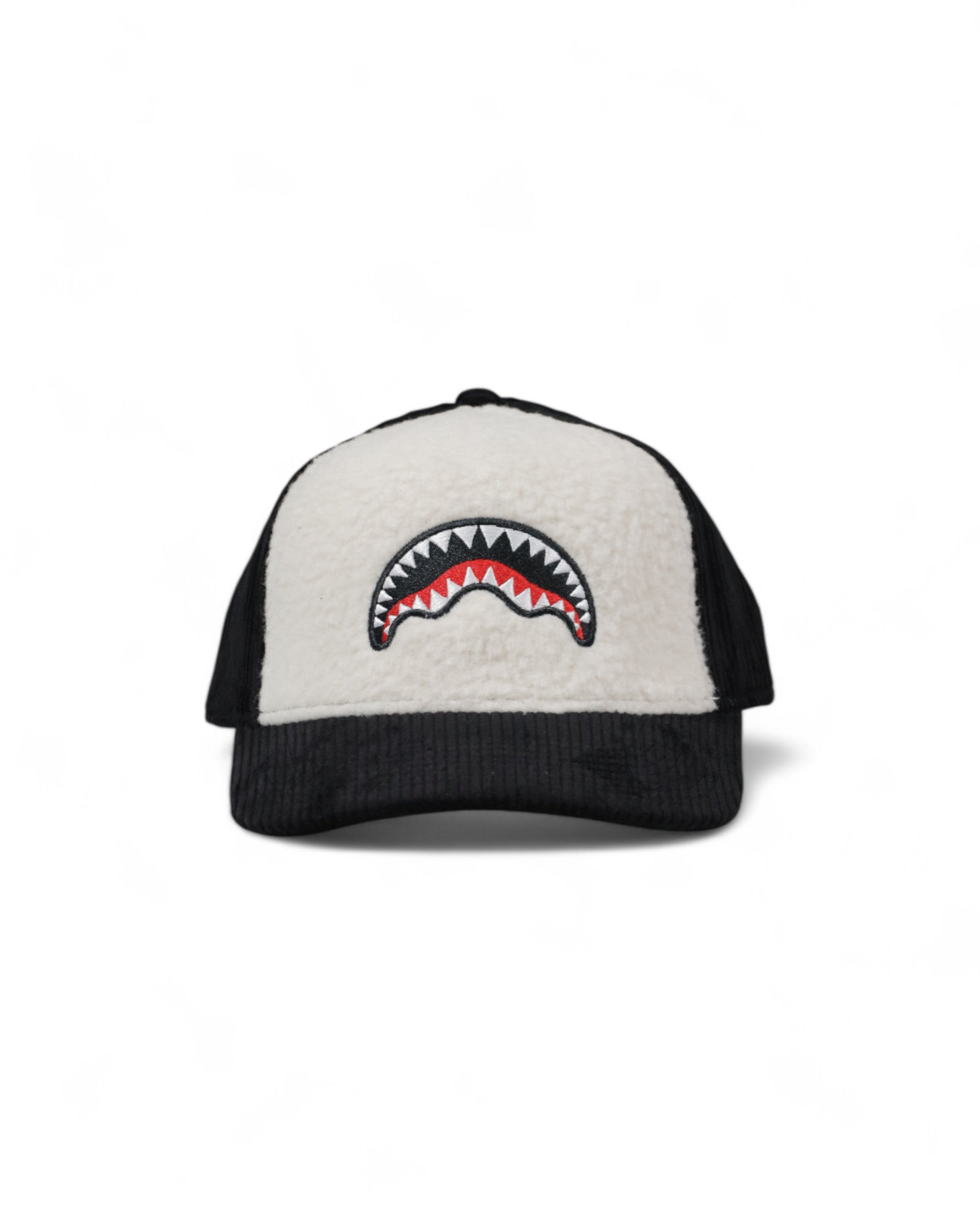 100% COTTON CORDUROY VISOR CAP WITH CONTRASTING IVORY TEDDY FRONT PANEL WITH LOGO EMBROIDERY IN CENTER. ADJUSTABLE VELCRO CLOSURE.