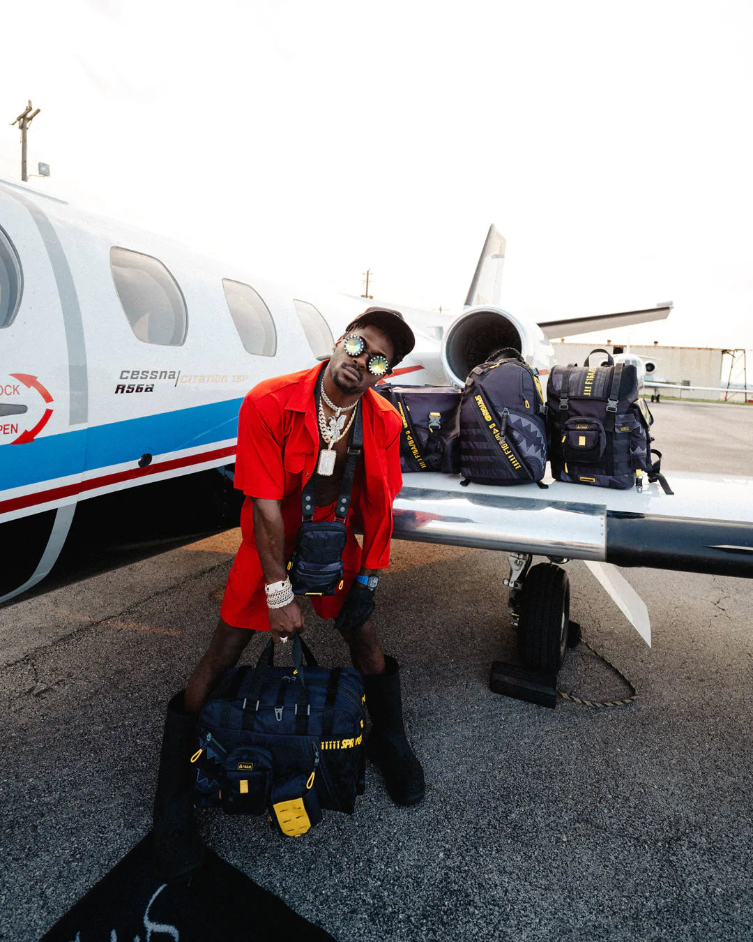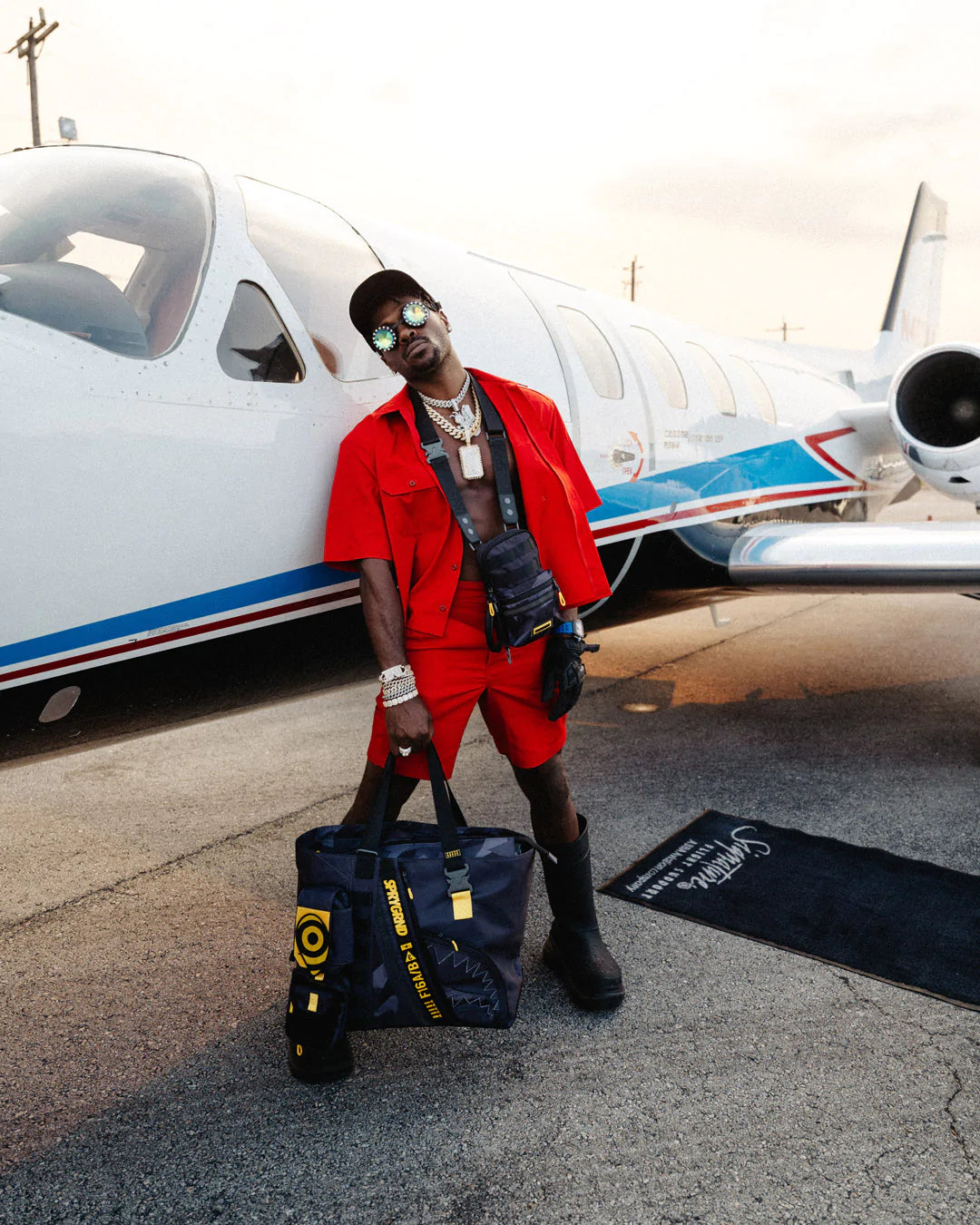 Fabric made from polyester satin weave with monochromatic camo details and contrast yellow trims