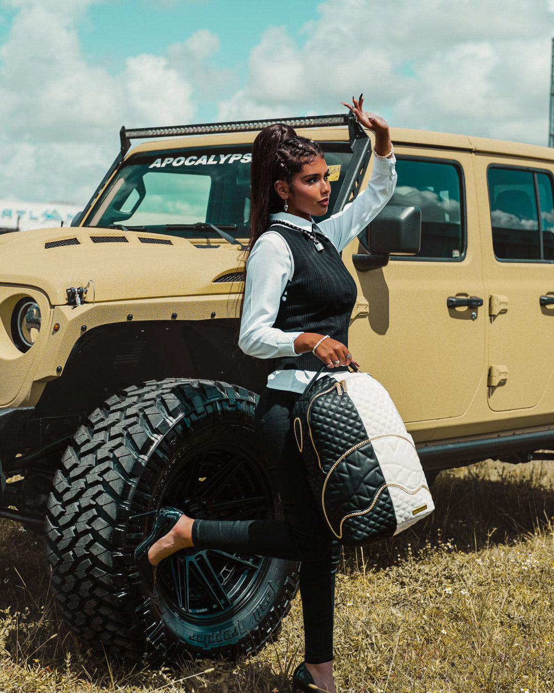 Dimensions: 18″ x 6″ x 11.5″ • Front zipper pocket • Side pockets • Zippered Stash pocket • Separate velour sunglass compartment • Ergonomic mesh back padding • Adjustable Straps for custom sizing • Gold zippers with metal hardware • Metal « Sprayground Authentic » badge • Slide through back sleeve connects to carry-on luggage to free your hands