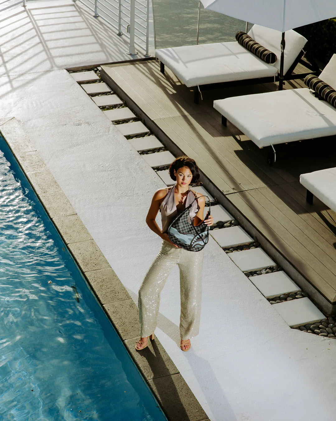 Gunmetal chain attached to the zipper, studs, and SG handle detail plus one interior pocket.