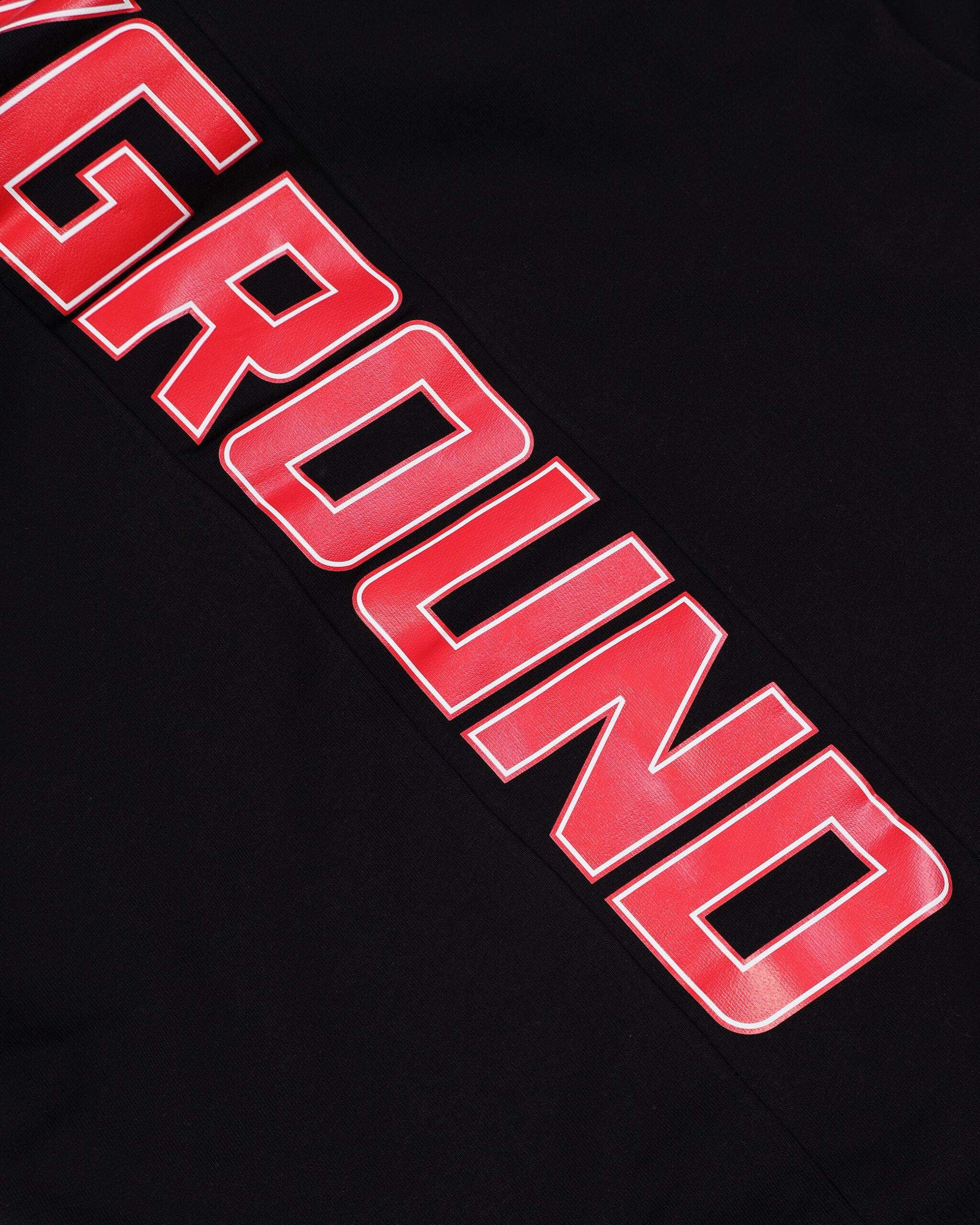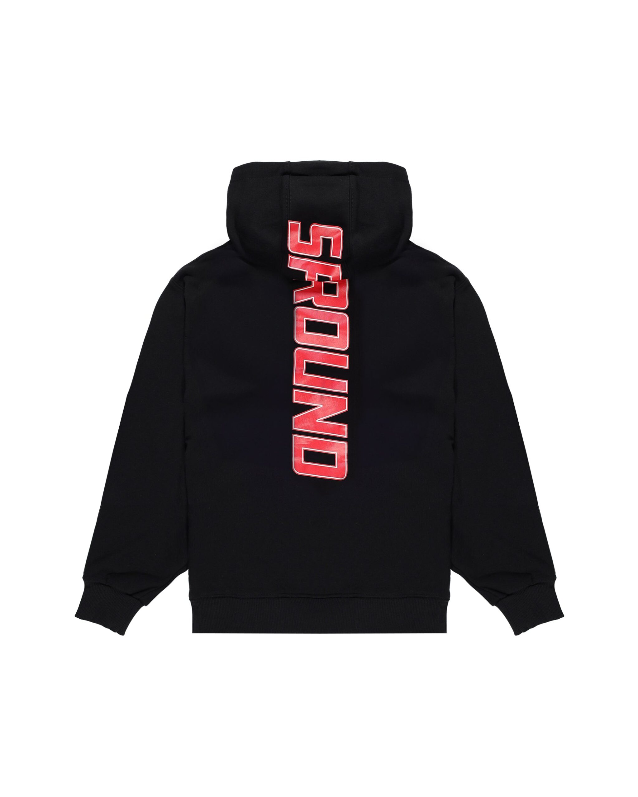 Silkscreen logo print under the pouch pocket and large print all along the back and hood.