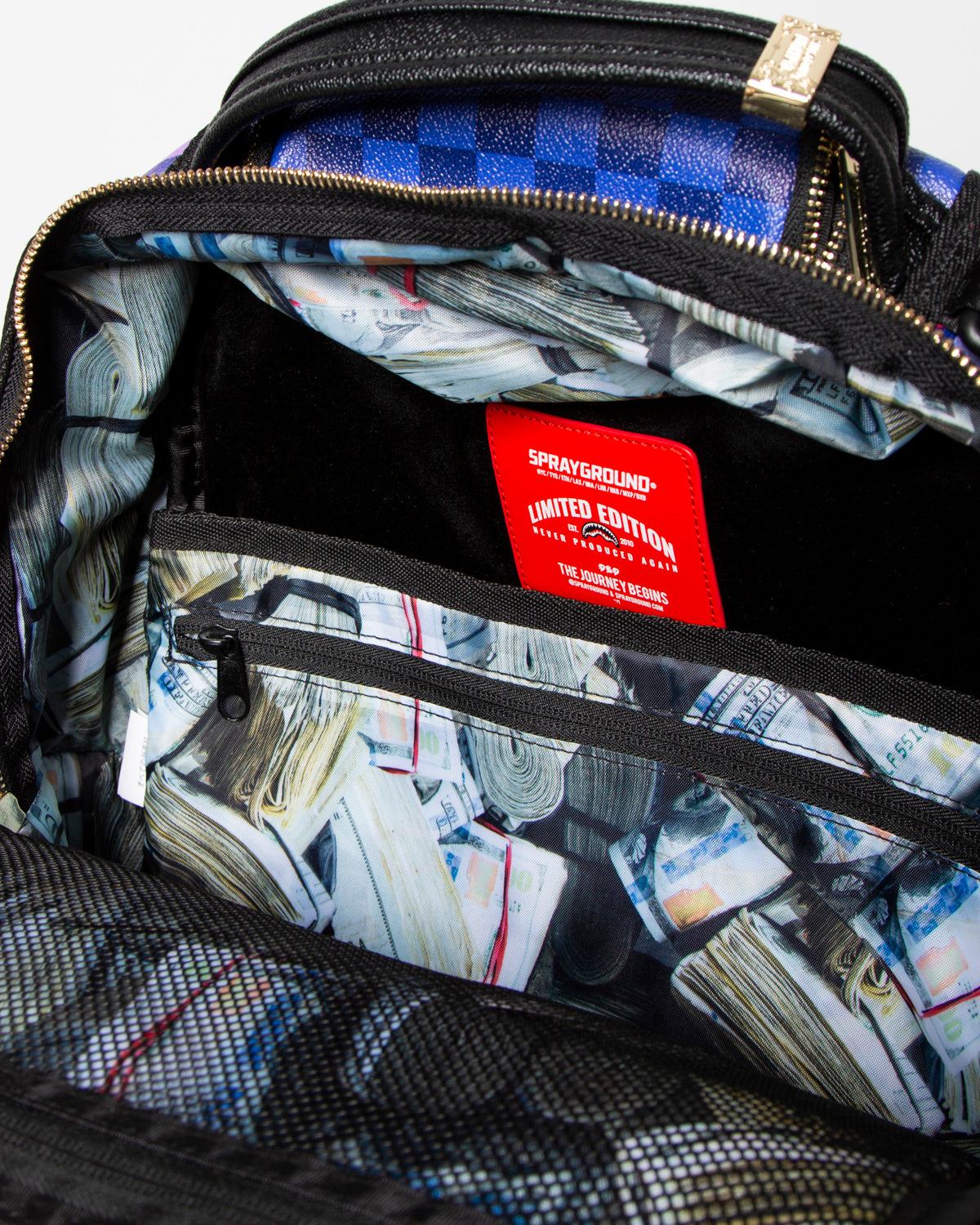 Dimensions: 18″ x 6″ x 11.5″ • Front zipper pocket • Side pockets • Zippered Stash pocket • Separate velour sunglass compartment • Ergonomic mesh back padding • Adjustable Straps for custom sizing • Gold zippers with metal hardware • Metal « Sprayground Authentic » badge • Slide through back sleeve connects to carry-on luggage to free your hands