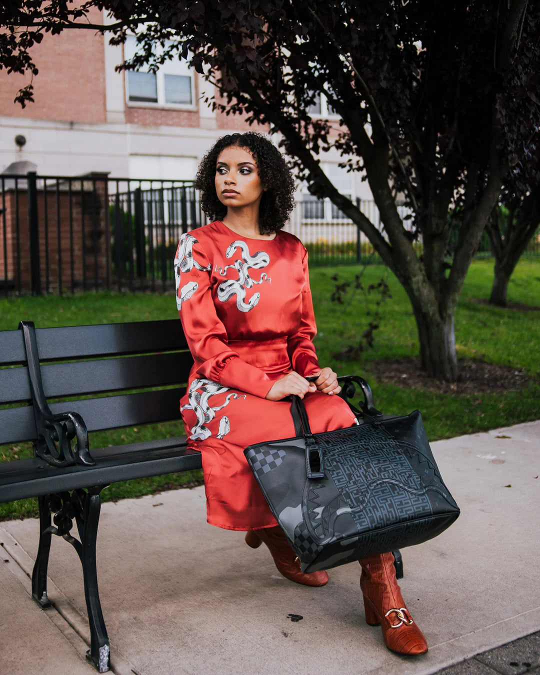 Dimensions: 19″ x 6.5″ x 11.5″ • Top zipper opening • Top double handle • Sprayground keychain • Gold zippers with metal hardware