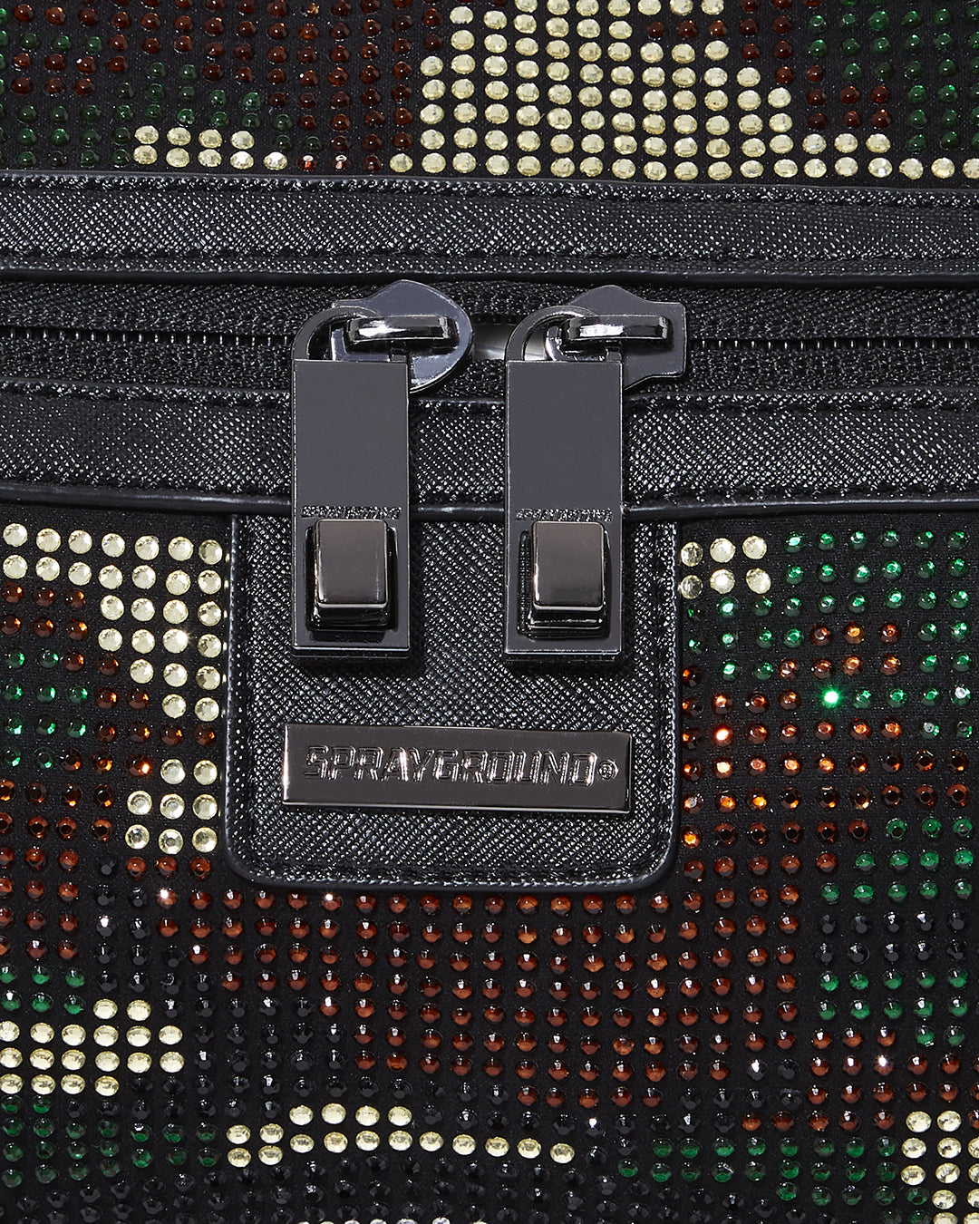 Dimensions: 8″ x 7.5″ x 13″ • Zippered top opening • Zippered pocket on back panel • Zippered side pocket • Removable adjustable strap for custom sizing with reinforced crossbody construction • Logo embossed shoulder pad for comfort • Gold and silver zippers with metal hardware • Zippered stash pocket.