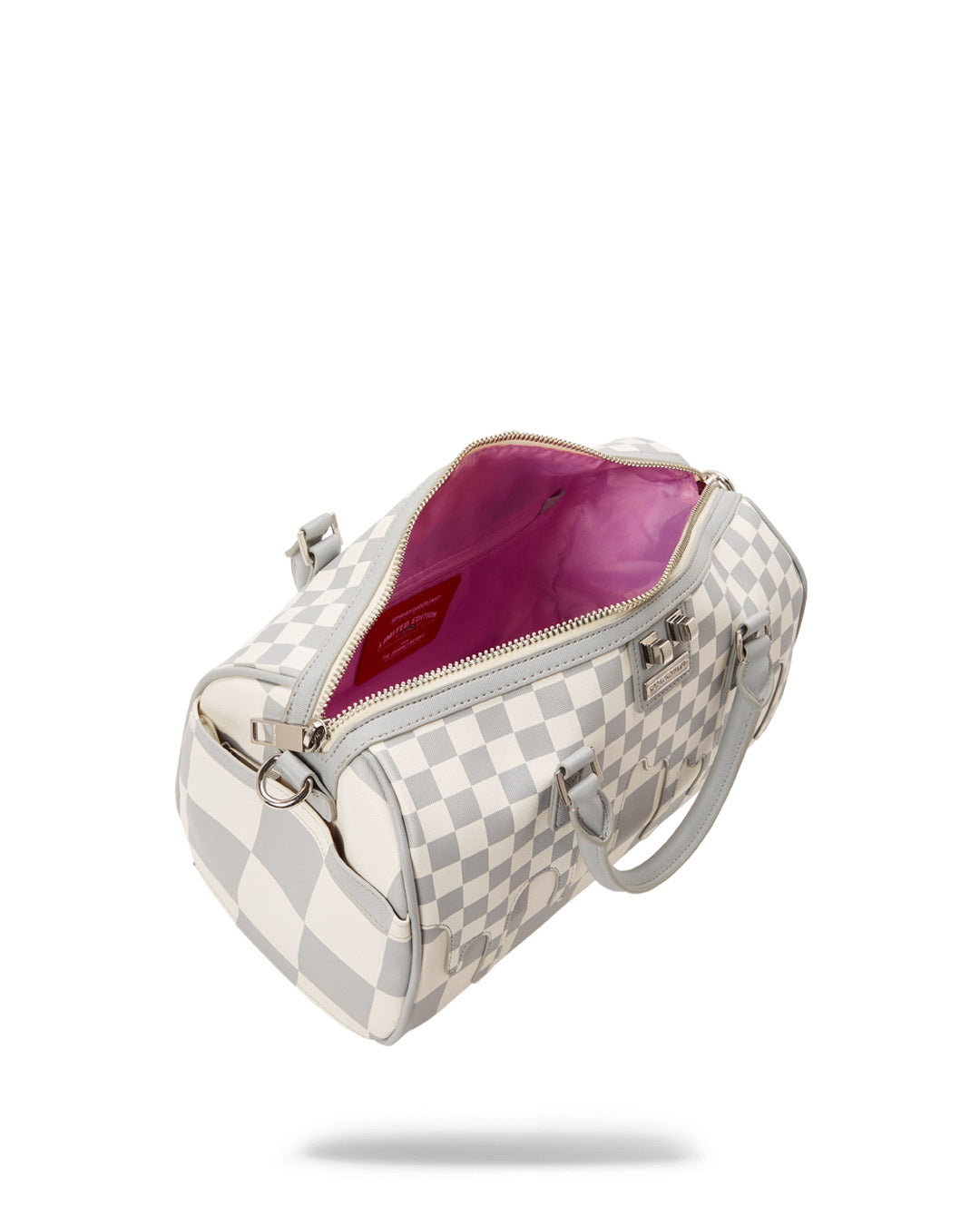 Dimensions: 8″ x 7.5″ x 13″ • Zippered top opening • Zippered pocket on back panel • Zippered side pocket • Removable adjustable strap for custom sizing with reinforced crossbody construction • Logo embossed shoulder pad for comfort • Gold and silver zippers with metal hardware • Zippered stash pocket.