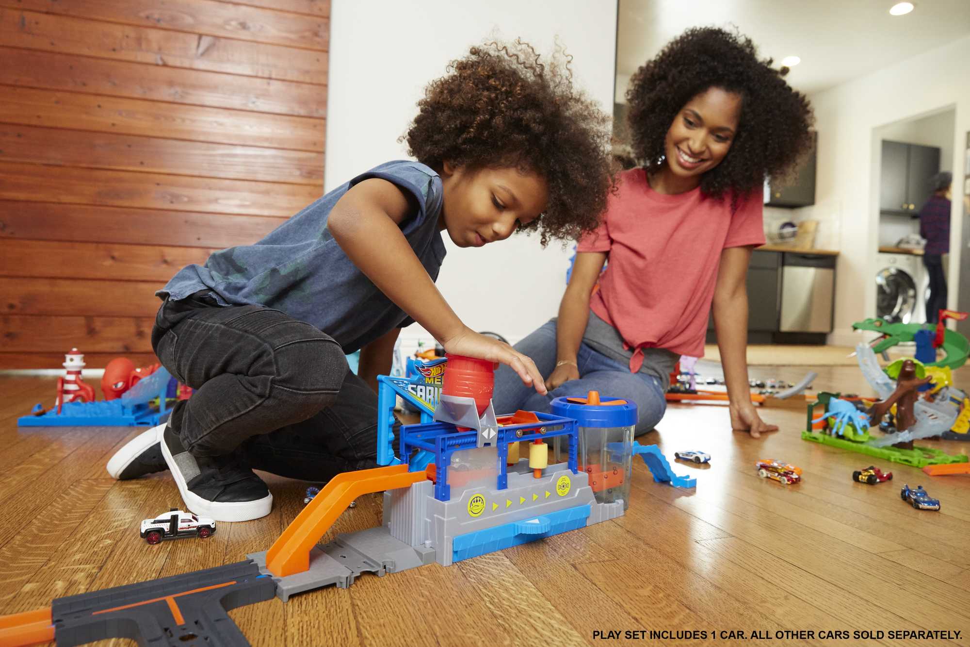 The Hot Wheels Mega Car Wash has all the features of a real car wash in Hot Wheels City with an automated conveyer belt that transports cars through the set with real water action. Surprising color change features fuel creativity and storytelling as kids take their cars through a spin in the Hot Wheels Mega Car Wash. Pull the handle back and drive your car into the car wash to begin riding the automatic conveyer belt. When kids squeeze warm water onto their Color Shifters car, it magically changes color! Then towel dry the vehicle before the automatic conveyer belt drops you into the dunk tank for another magical color change transformation. Kids can spin the fan to raise their car and dry it off before heading off to their next adventure! The Hot Wheels Mega Car Wash nurtures creative thinking with familiar city themed locations using push-around play plus cool color change features to deliver hours of play. The Mega Car Wash has multiple connections points to connect to other Hot Wheels sets for a customizable world of track and play.