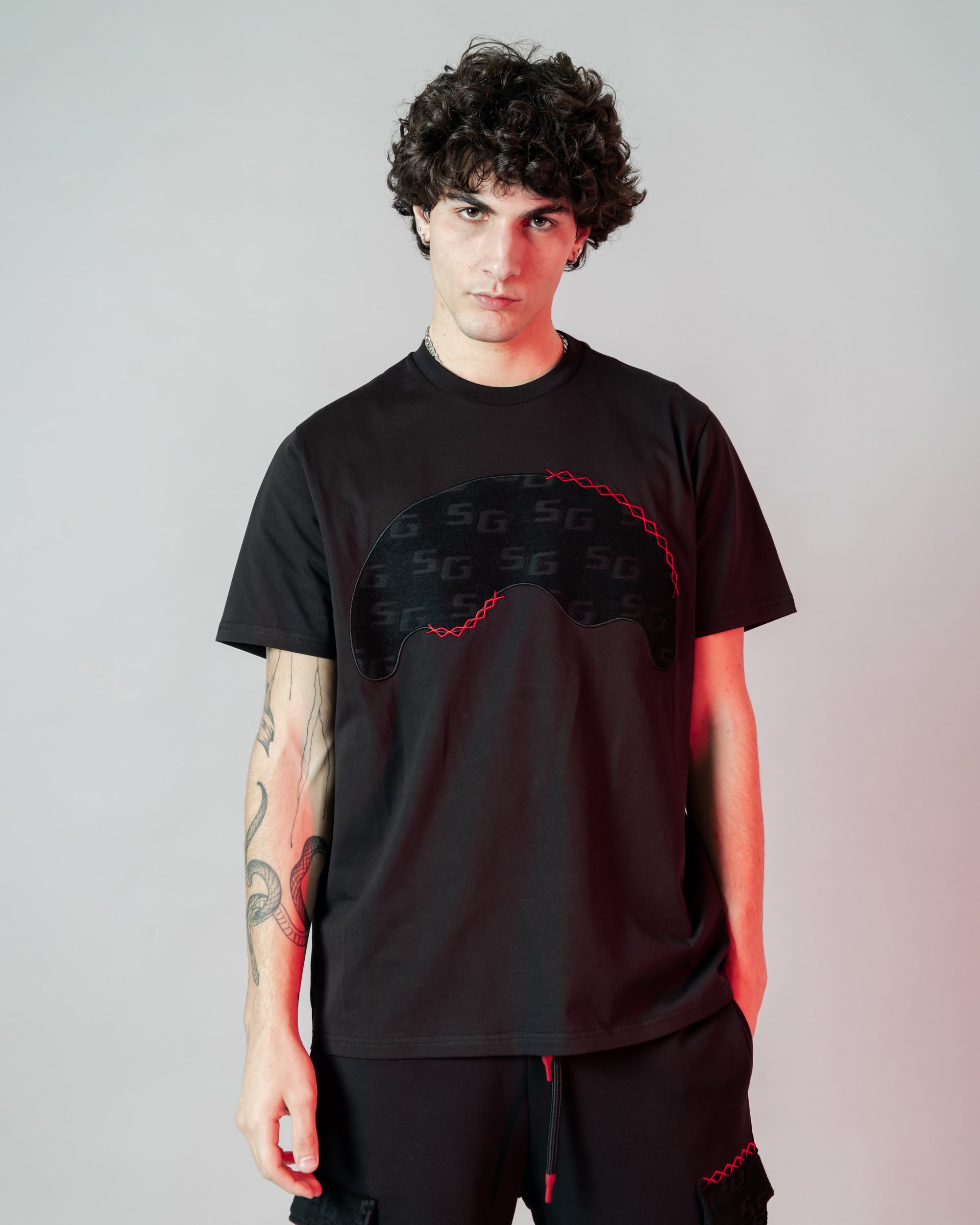 BLACK T-SHIRT IN 100% COTTON JERSEY 190 GR/MQ. TONE-ON-TONE JACQUARD FABRIC PATCH WITH CONTRAST EMBROIDERY AND RAISED PRINT ON THE BACK.