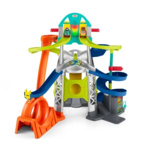 From fueling up, tuning up, and zooming all around, there’s miles of fun for toddlers to discover at the Little People Helpful Neighbor’s Garage! Turn the crank to ride the elevator up the garage levels. Ding, ding! Help a neighbor fix their car! Lift the mechanic’s platform to take a look under the hood, while the second car « charges » at the « electronic charging » station. When they’re ready to roll, kids can send each Wheelies vehicle zooming down the spiral ramp to head out on their next adventure. Don’t forget to fill up at the gas pump!