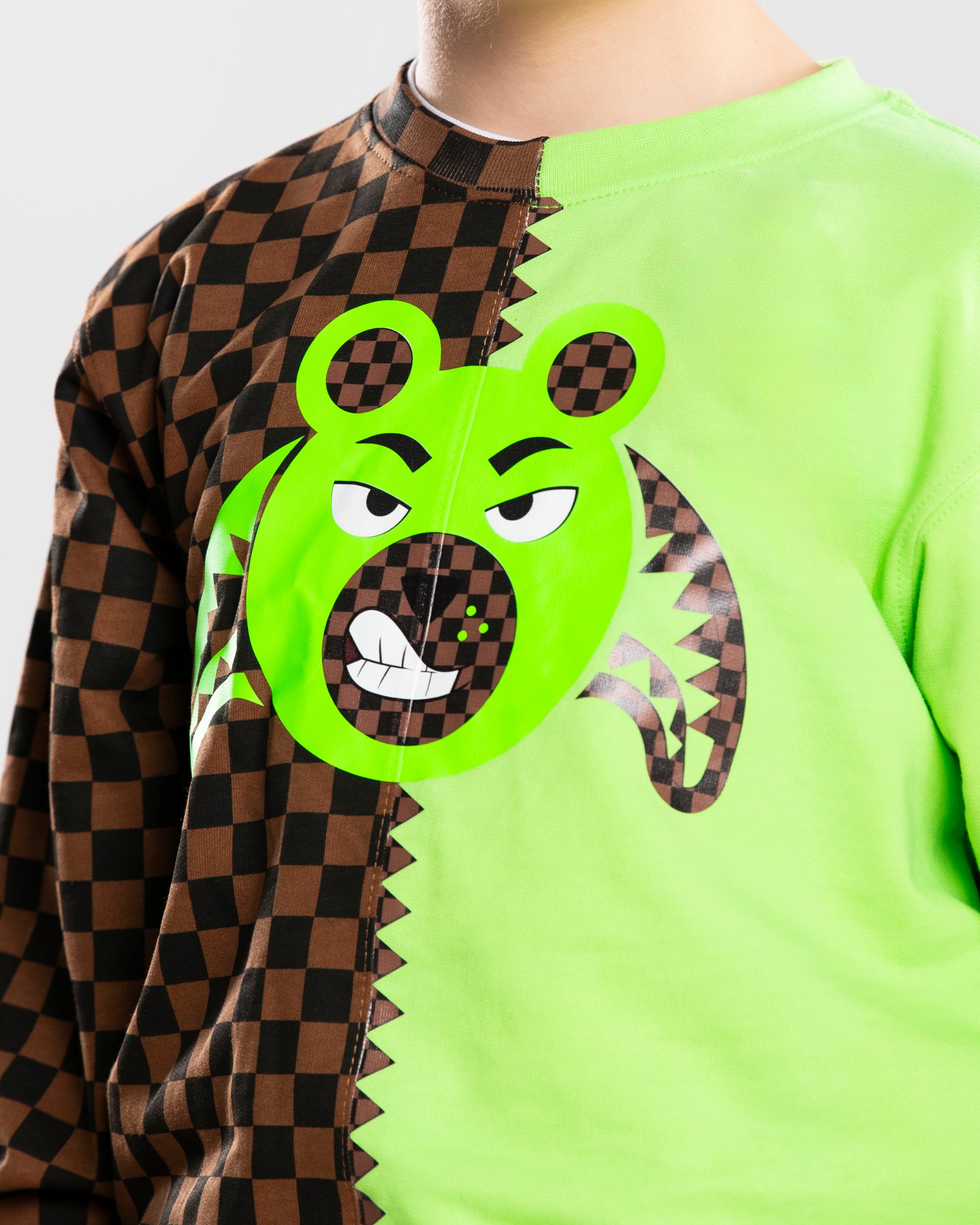Half garment with all over brown checkered pattern and half garment in neon green.