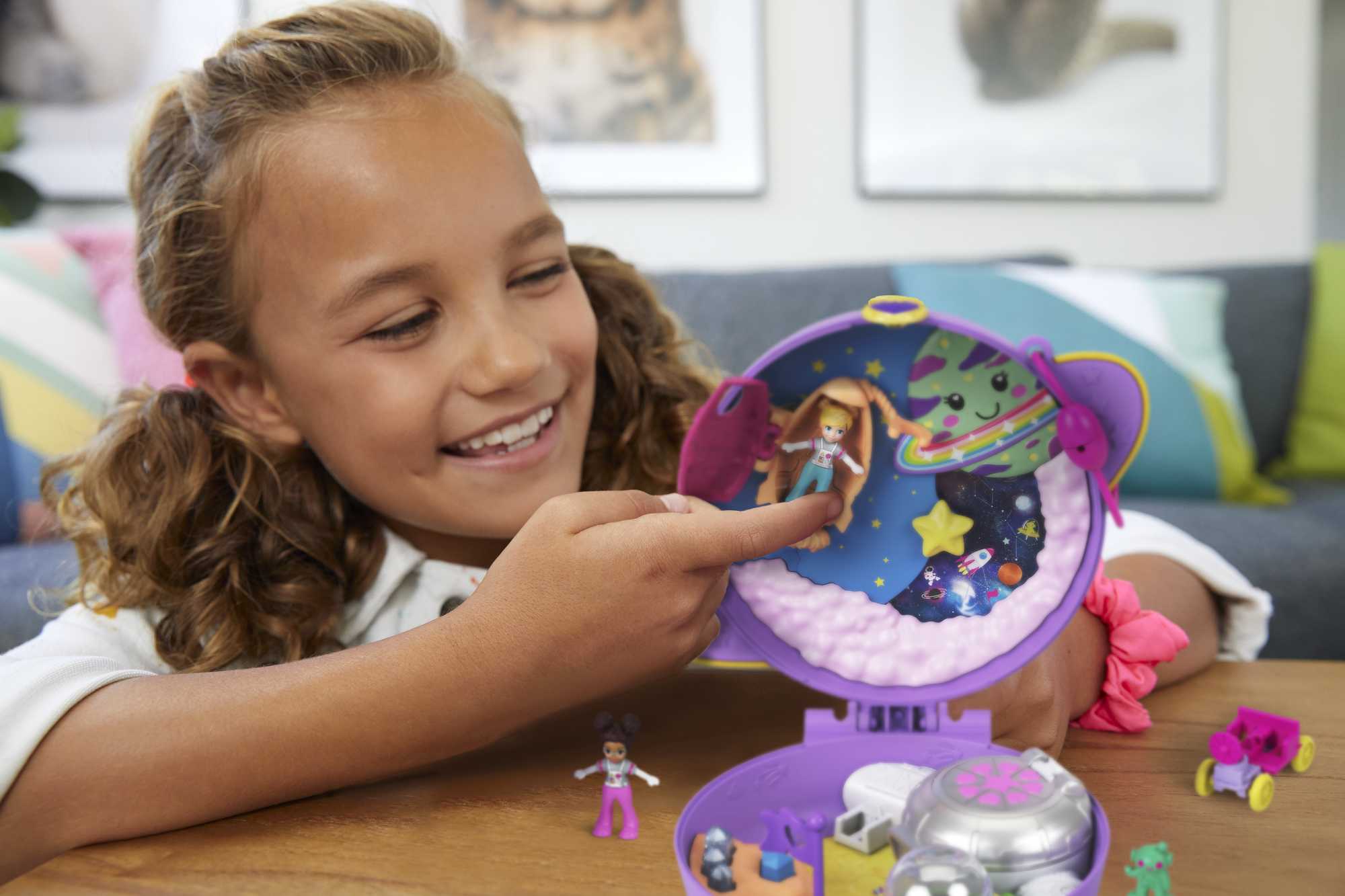 Time for Passport Adventures with Polly Pocket! Take this exciting Saturn Space Explorer compact on the go for an out-of-this-world adventure! Shaped like the planet Saturn, this compact features colorful topography, an outer planet ring and includes micro Polly and Shani dolls, a removable lunar vehicle and an alien friend! Open the compact and blast off with these fun activities: the space station opens to a lab and bedroom; the UFO top opens and fits one doll; the removable lunar vehicle fits inside and can go outside of the compact (also fits both dolls); a star spins to reveal different images; and crystals pop up when a rocky area is pressed! The compact also comes with a strap so kids can wear it as a wristlet or purse! With Polly Stick technology, the micro dolls can stick anywhere on the compact. Place a sticker from the sticker sheet (included) on the compact and the dolls will stick to the sticker wherever placed. Compact is small enough to take anywhere, anytime for fun Polly Pocket adventures. Makes a great gift for ages 4 years old and up especially those who love space exploration, science and shooting for the stars! Colors and decorations may vary.