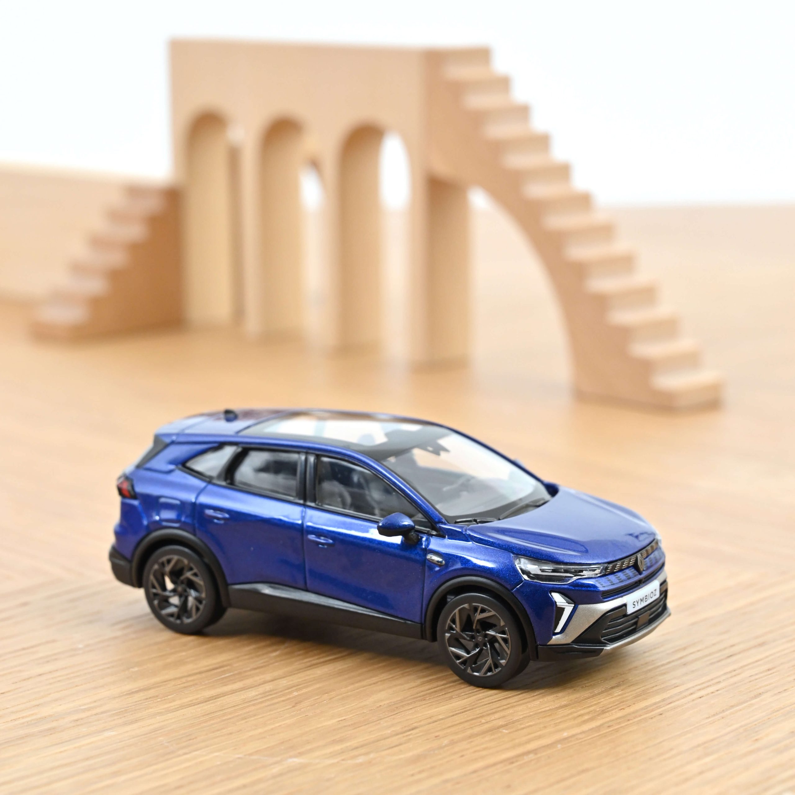 Le Renault Symbioz a été présenté en 2024 dans plusieurs finitions, dont la désormais classique Esprit Alpine. Celle-ci se distingue par ses jantes spécifiques et la partie inférieure de son pare-chocs en gris anthracite, ainsi que d’autres éléments marqués d’une tonalité foncée. La miniature proposée par Norev en Bleu Iron met en avant le côté sportif souhaité par Renault.