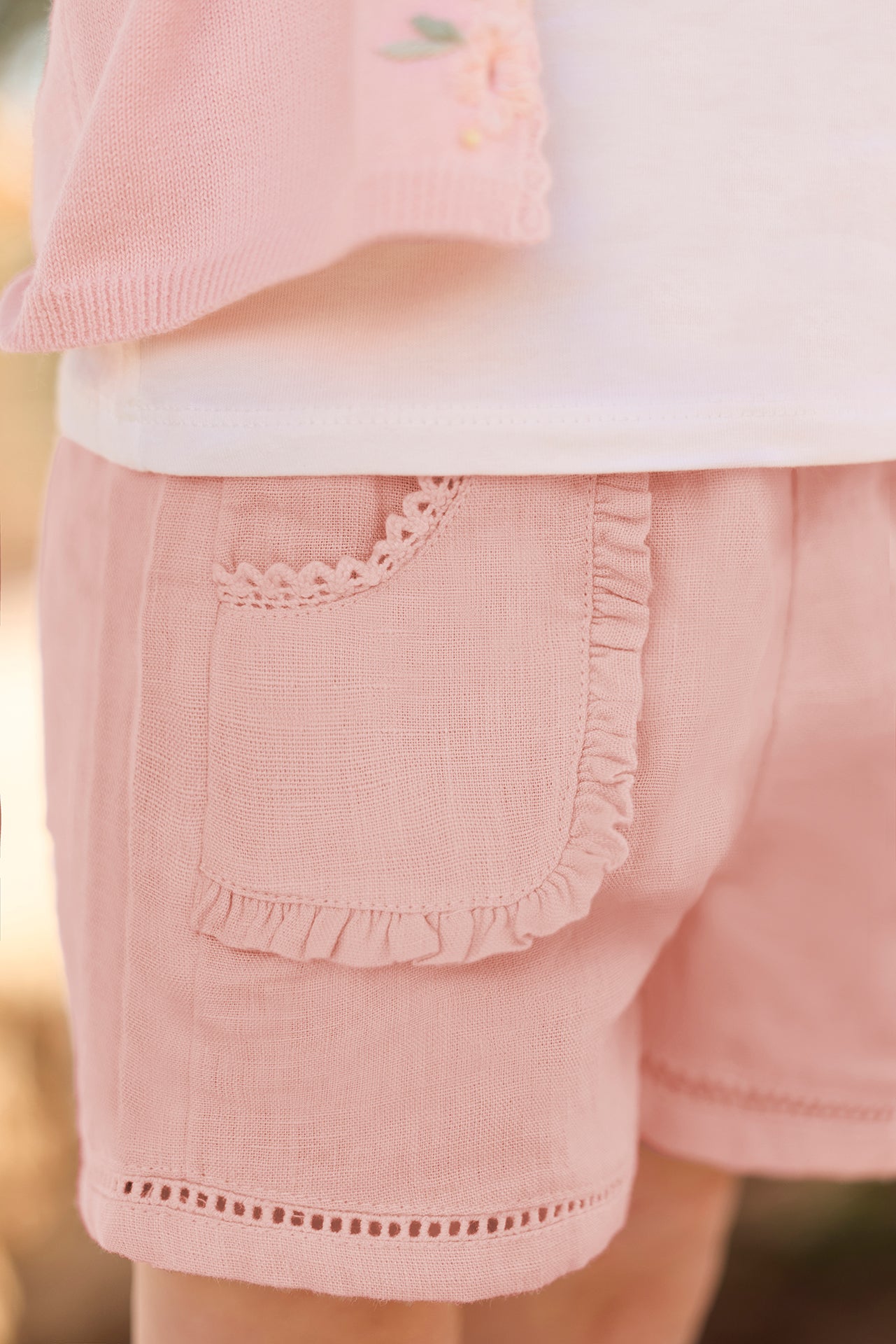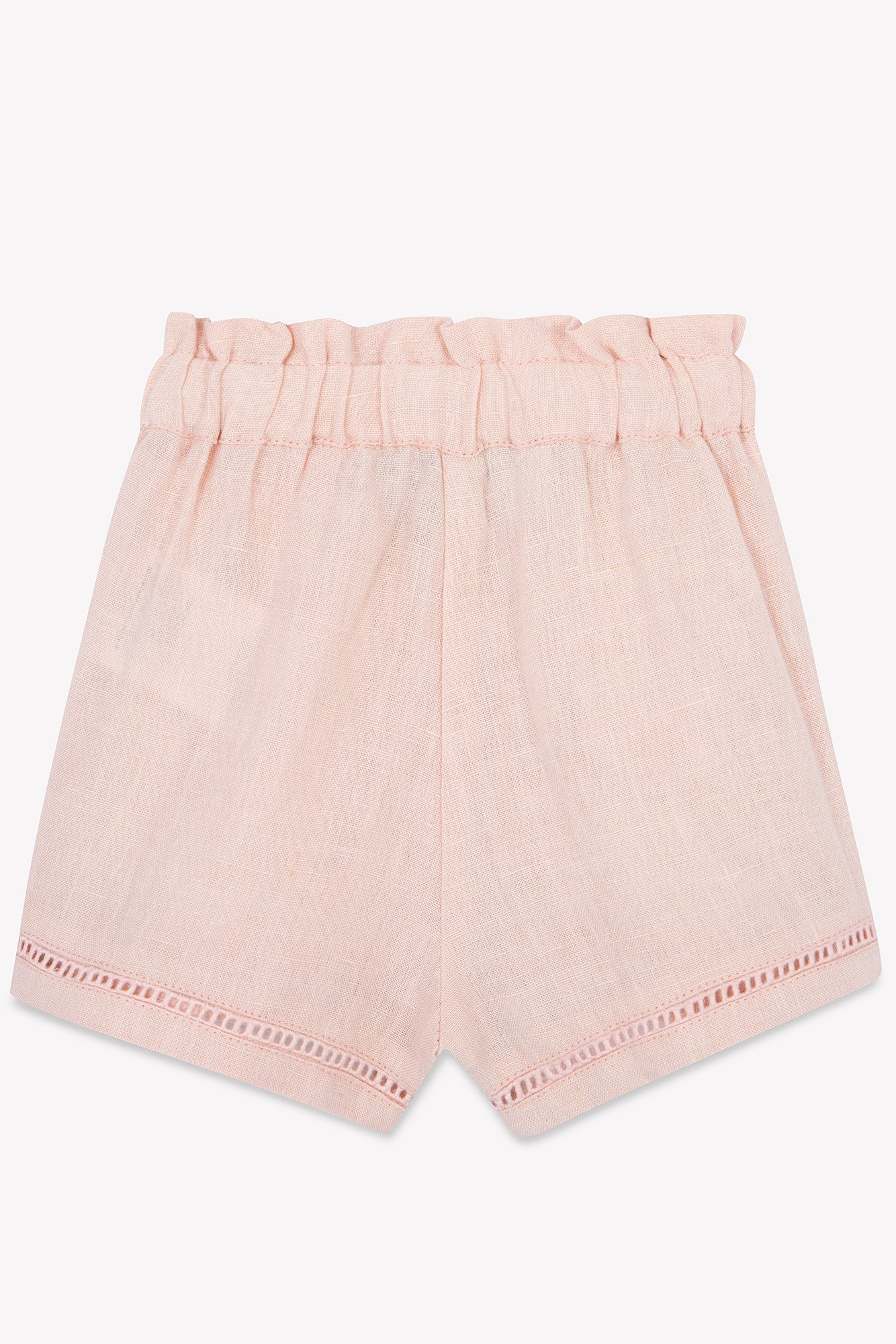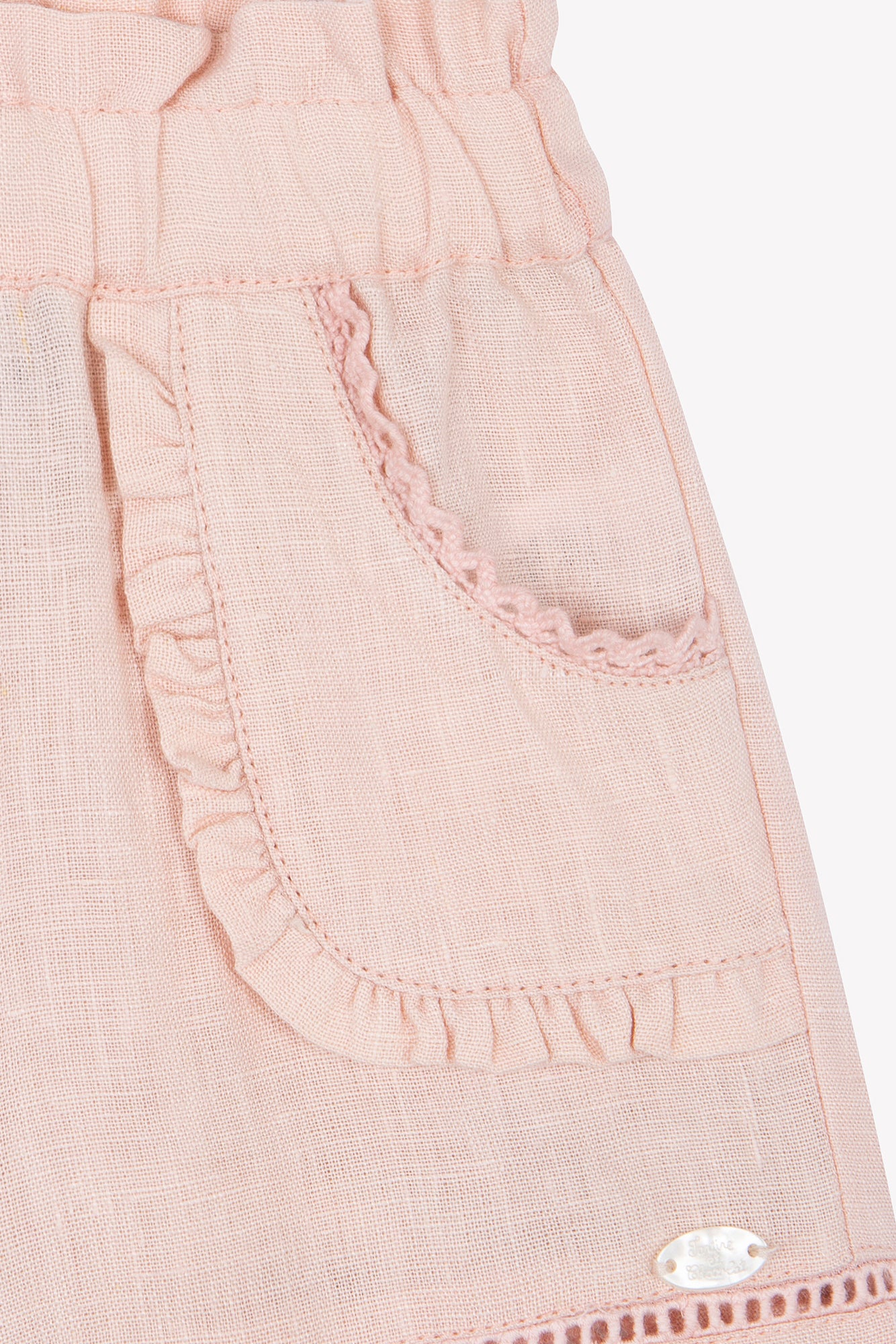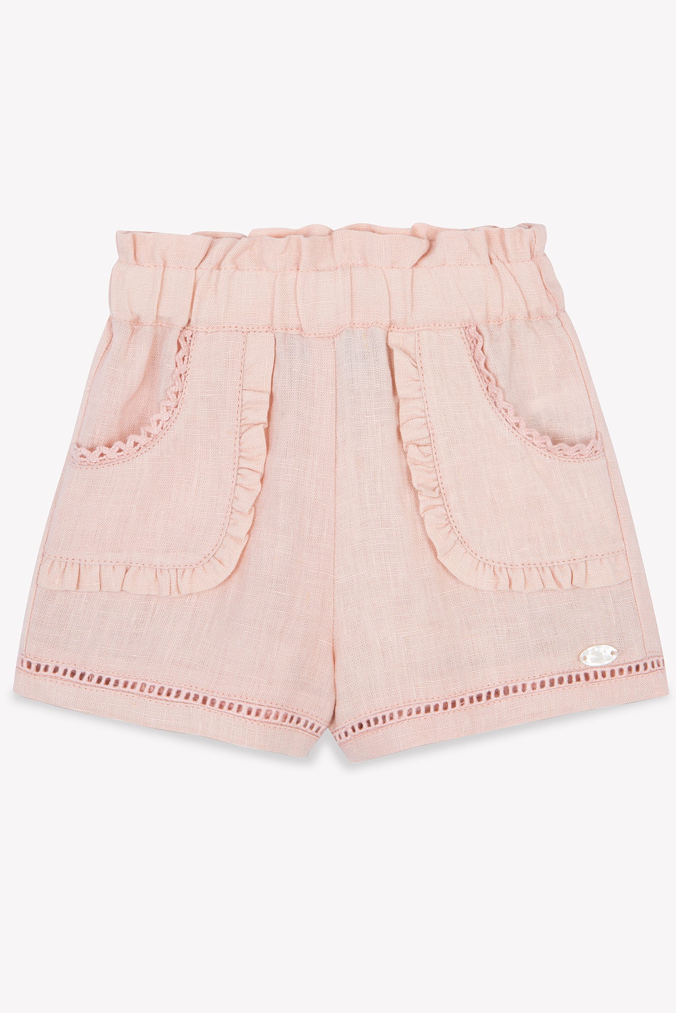 Ce short en lin couleur pivoine pour bébé fille se distingue par ses détails ajourés délicats et par son petit volant qui orne les poches. Avec sa taille élastique, il offre confort et élégance, parfait pour une tenue estivale pleine de charme. CA26011-30